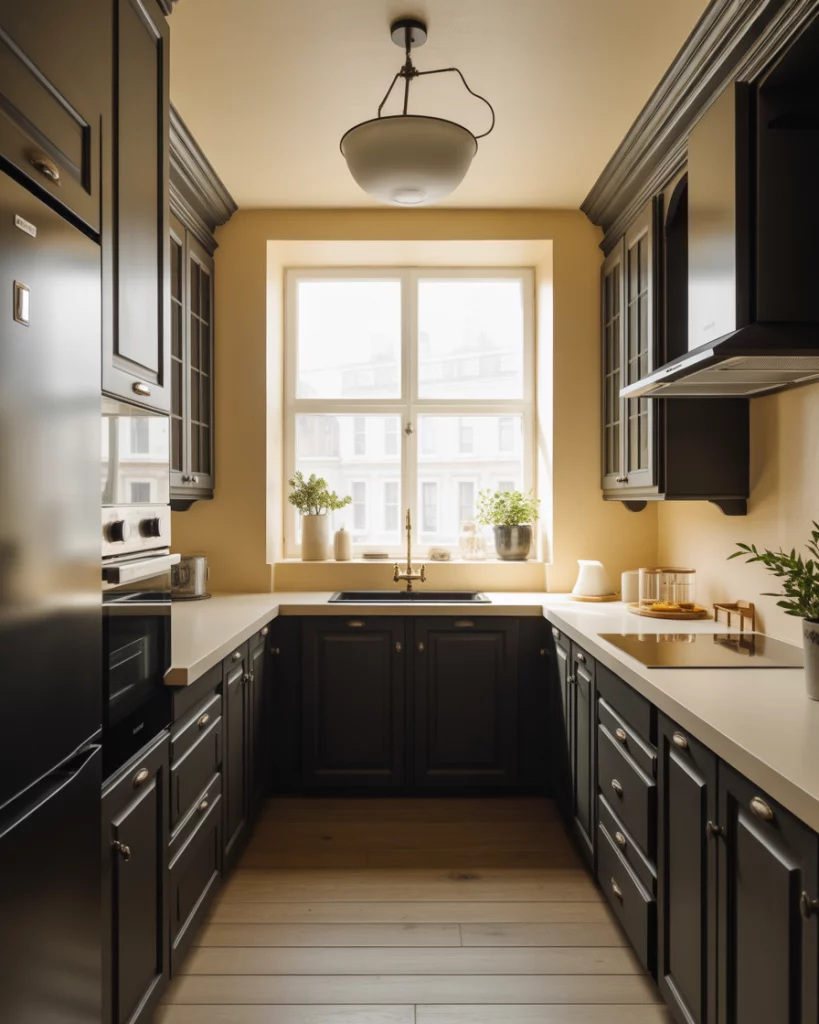 Minimalism thrives when the focus is on clean lines. Black cabinets with seamless panels conceal appliances, creating a unified aesthetic. A matte finish on countertops and a streamlined sink reinforce the uncluttered vibe. Add subtle decor like sculptural accessories or a slim table for function. The design works best in small spaces, making them feel sleek and intentional.