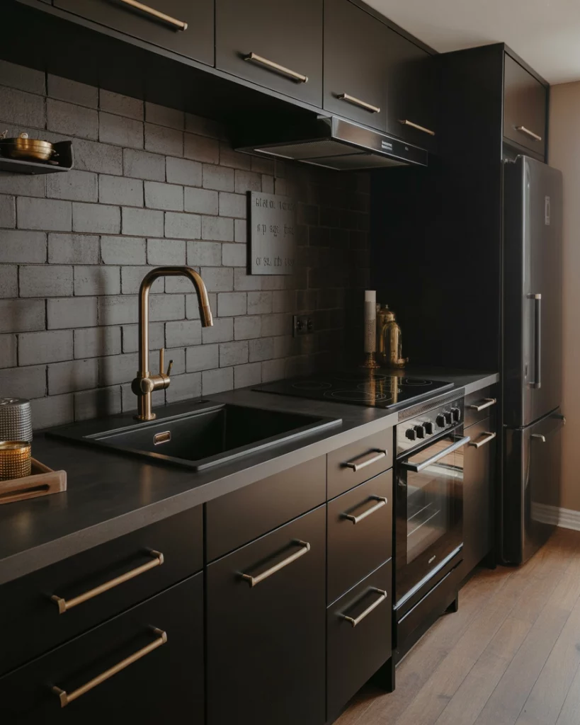 One of the most timeless ways to elevate black kitchens is with warm metallics. Pair black cabinets with brushed brass hardware and statement appliances for a glowing contrast. A matte black sink paired with golden faucets feels especially refined. Add subtle metallic accessories and a solid table to complete the look. This design brings effortless luxury and inspiration into everyday cooking spaces.