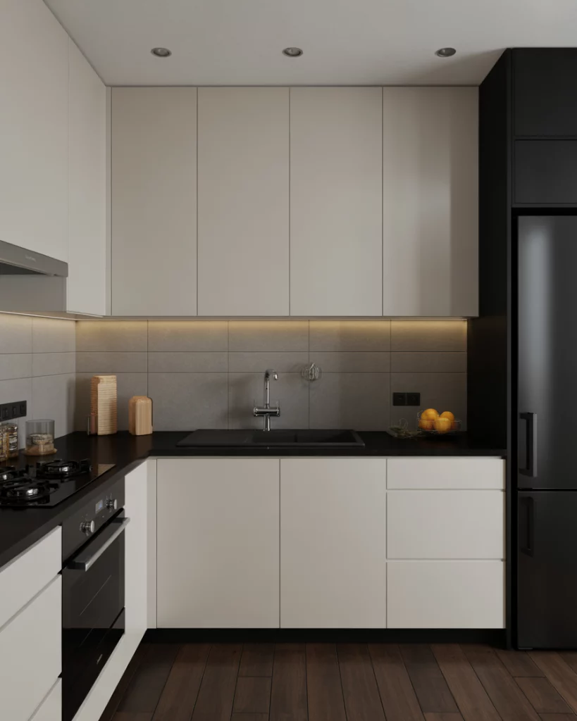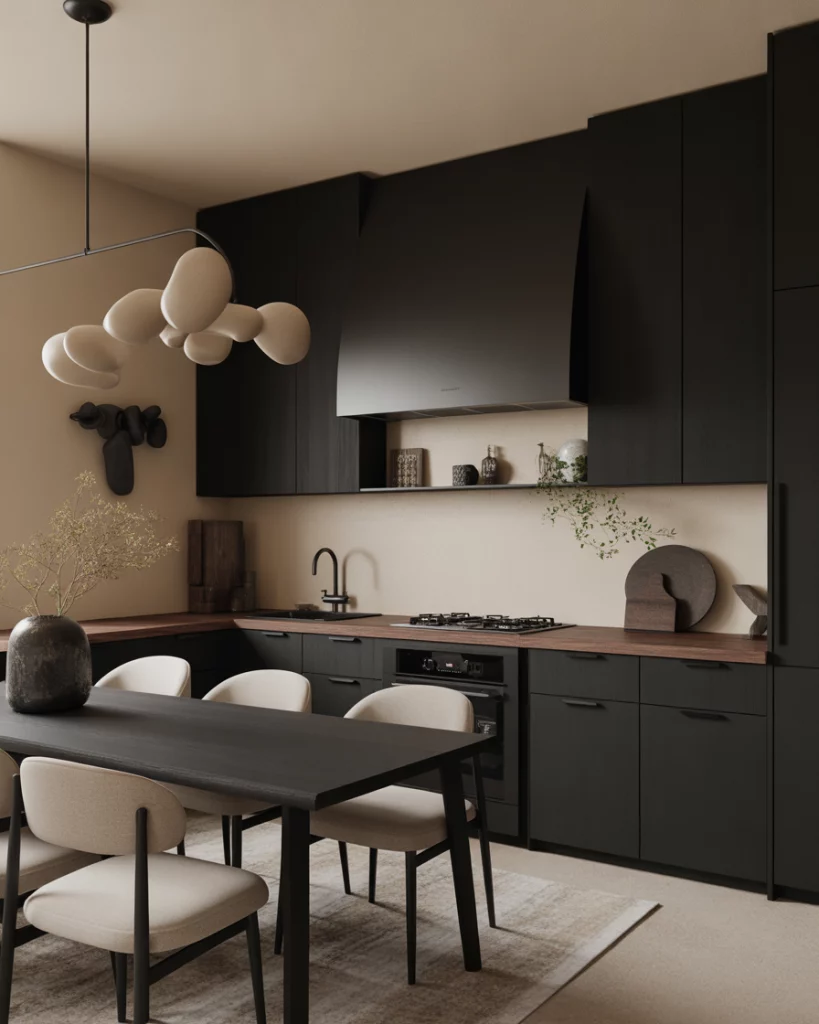 Combining beige and black brings warmth into a contemporary space. The neutral beige grounds the strong presence of black while keeping the kitchen flexible for different decor styles. A matte black island paired with beige walls or countertops creates a sophisticated aesthetic that works for all households. Add natural wood and textures for a calm yet stylish vibe.