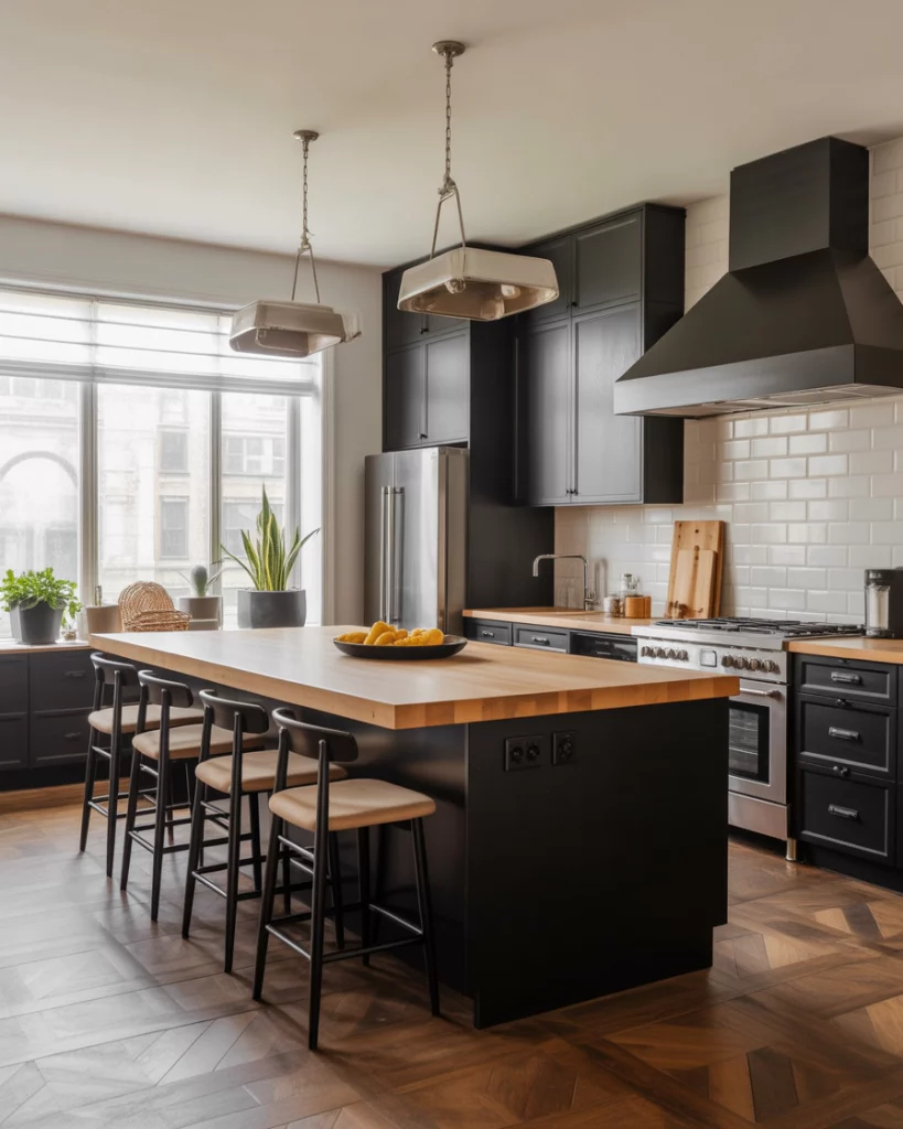Even families can embrace black kitchens when warmth is added. Pair wood countertop surfaces with black cabinets and a sturdy central table for gatherings. Add durable appliances, easy-clean hardware, and playful decor touches to make the space welcoming. The mix of wood and black creates an aesthetic that is both stylish and approachable for all ages.