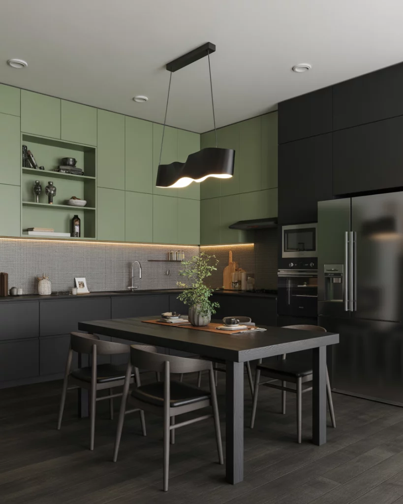 For homeowners seeking something adventurous, pairing black with green and bold accents offers fresh inspiration. Think dark forest cabinets ideas, sleek appliances, and an earthy table or island to anchor the palette. The green softens the sharpness of black while keeping the space modern. This mix recalls top interiors found on sites likeDezeenandArchDaily, showing how nature and urban edge can meet.