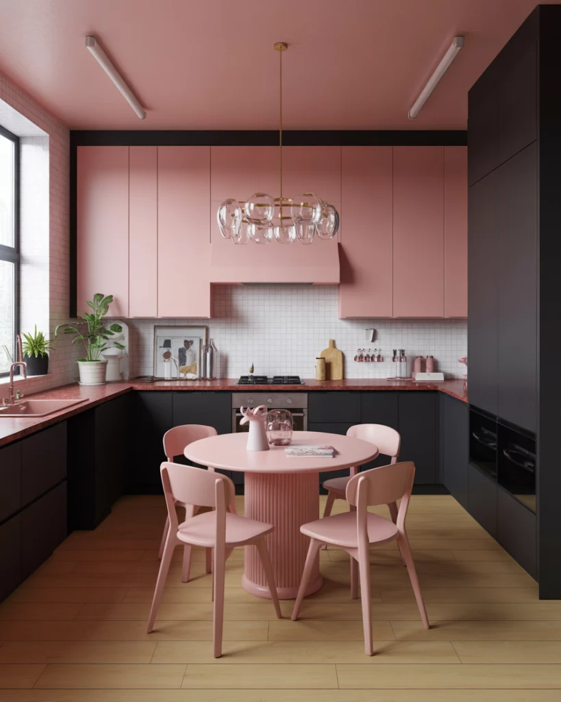 The combination of pink and black might sound unconventional, but it has become a playful trend embraced by top design bloggers. Black cabinets paired with soft blush countertops or decor accents bring personality and warmth. Add a blush table or subtle pastel accessories for charm. This pairing is especially appealing for younger homeowners who want inspiration that breaks away from tradition.