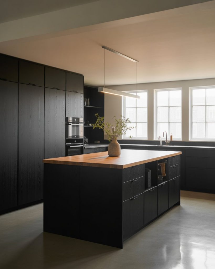 Black might seem heavy for Scandinavian spaces, but when paired with light wood and minimalist decor, it achieves stunning balance. Black islands with natural white oak or pale birch cabinets ideas create clean, simple lines. Add appliances with smooth finishes, a matte black sink, and subtle accessories for warmth. The inspiration here is calm, cozy, and clutter-free.