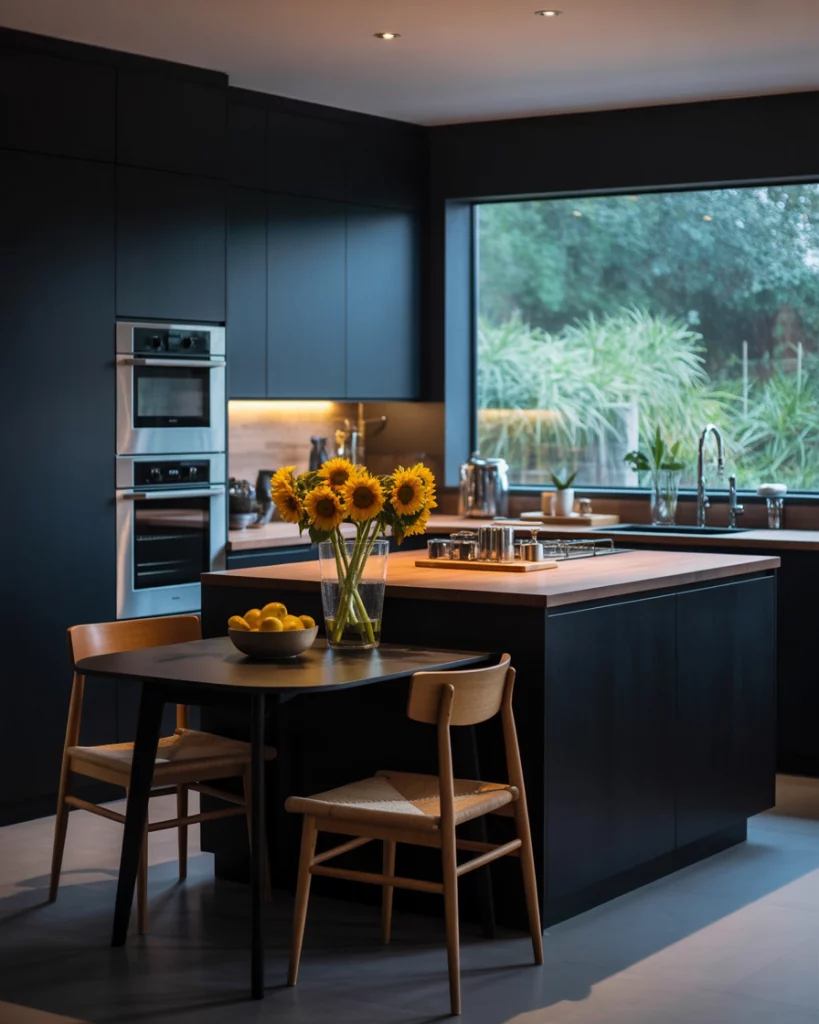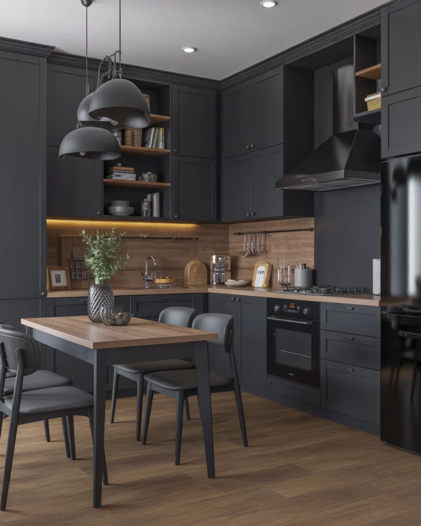 For homeowners seeking something adventurous, pairing black with green and bold accents offers fresh inspiration. Think dark forest cabinets ideas, sleek appliances, and an earthy table or island to anchor the palette. The green softens the sharpness of black while keeping the space modern. This mix recalls top interiors found on sites likeDezeenandArchDaily, showing how nature and urban edge can meet.