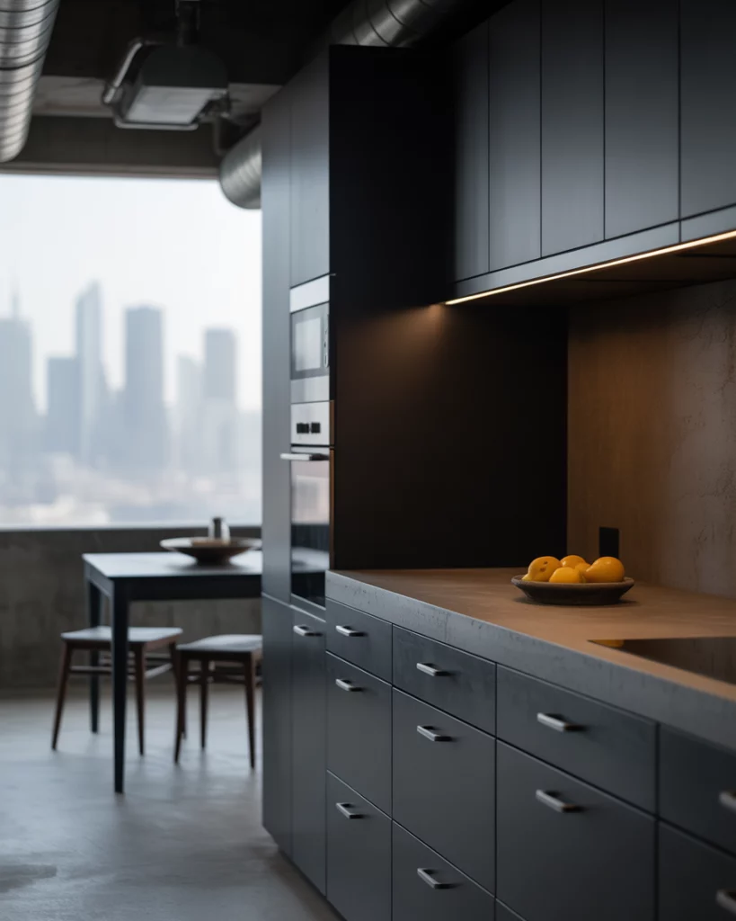 The industrial style is still thriving in 2026, and black fits right in. Pair black cabinets with concrete countertops, steel hardware, and exposed beams for an authentic urban vibe. A reclaimed wood countertop or rough-hewn table brings balance and warmth. This design works especially well in lofts or open spaces where raw details create character and bold aesthetic presence.