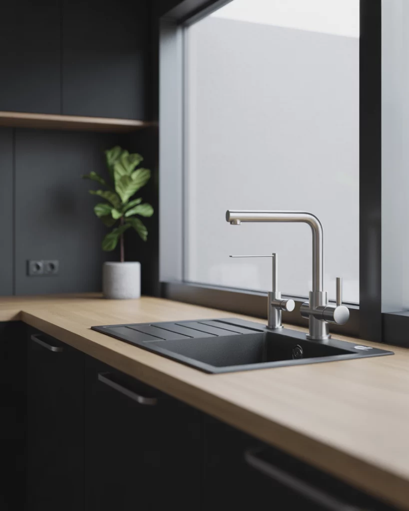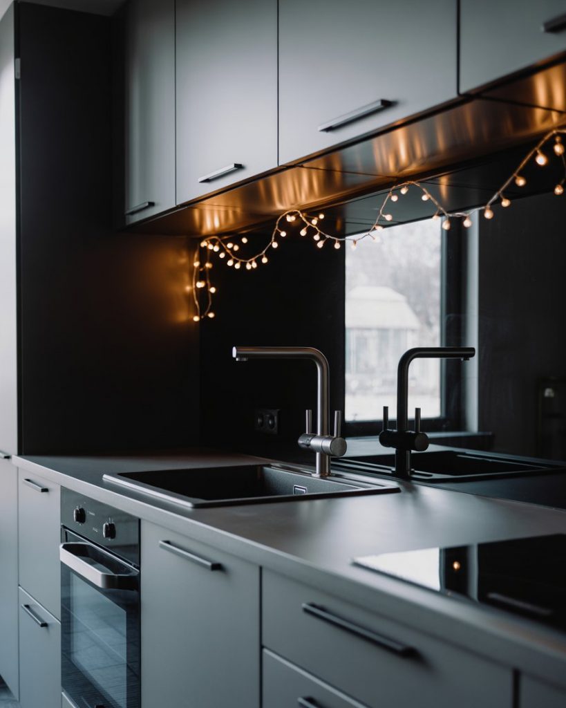 If you want drama without going full dark, grey and black is the perfect blend. Think smoky-toned cabinets ideas with matte black hardware and steel appliances for balance. This pairing offers design flexibility—modern, industrial, or even minimalist. A soft grey table or sink creates visual relief while enhancing the bold atmosphere of the black kitchen.