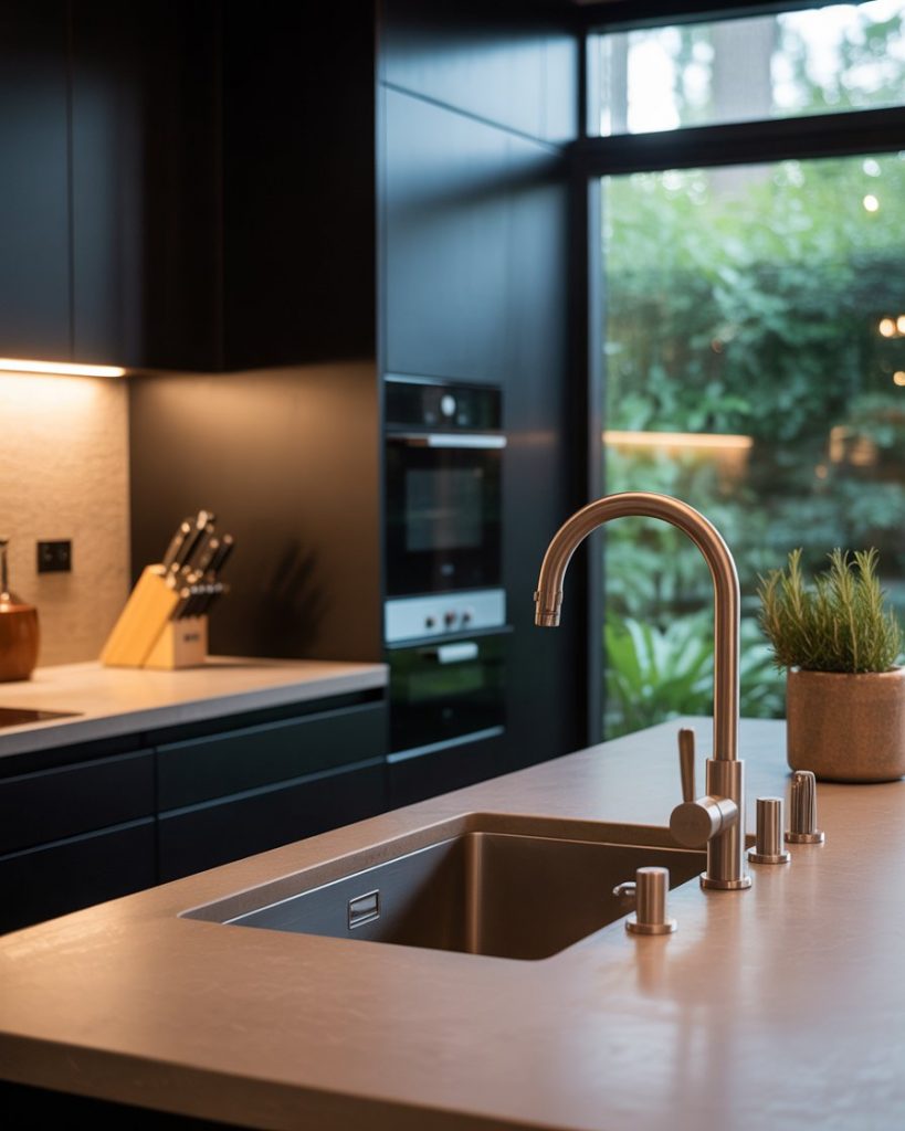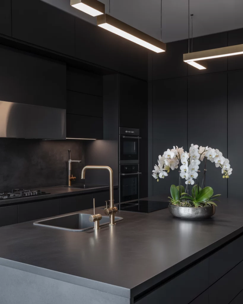One of the most timeless ways to elevate black kitchens is with warm metallics. Pair black cabinets with brushed brass hardware and statement appliances for a glowing contrast. A matte black sink paired with golden faucets feels especially refined. Add subtle metallic accessories and a solid table to complete the look. This design brings effortless luxury and inspiration into everyday cooking spaces.