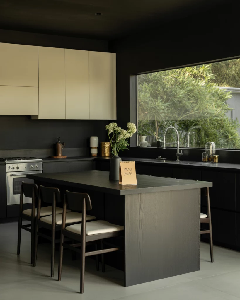 Technology is shaping the kitchens of 2026, and black interiors pair perfectly with smart appliances. From touch-activated ovens to hidden fridges, sleek tech blends seamlessly into matte cabinets and stone countertops. Add a tech-friendly island with charging stations or a multifunctional table. This design delivers both inspiration and convenience, appealing to all ages.