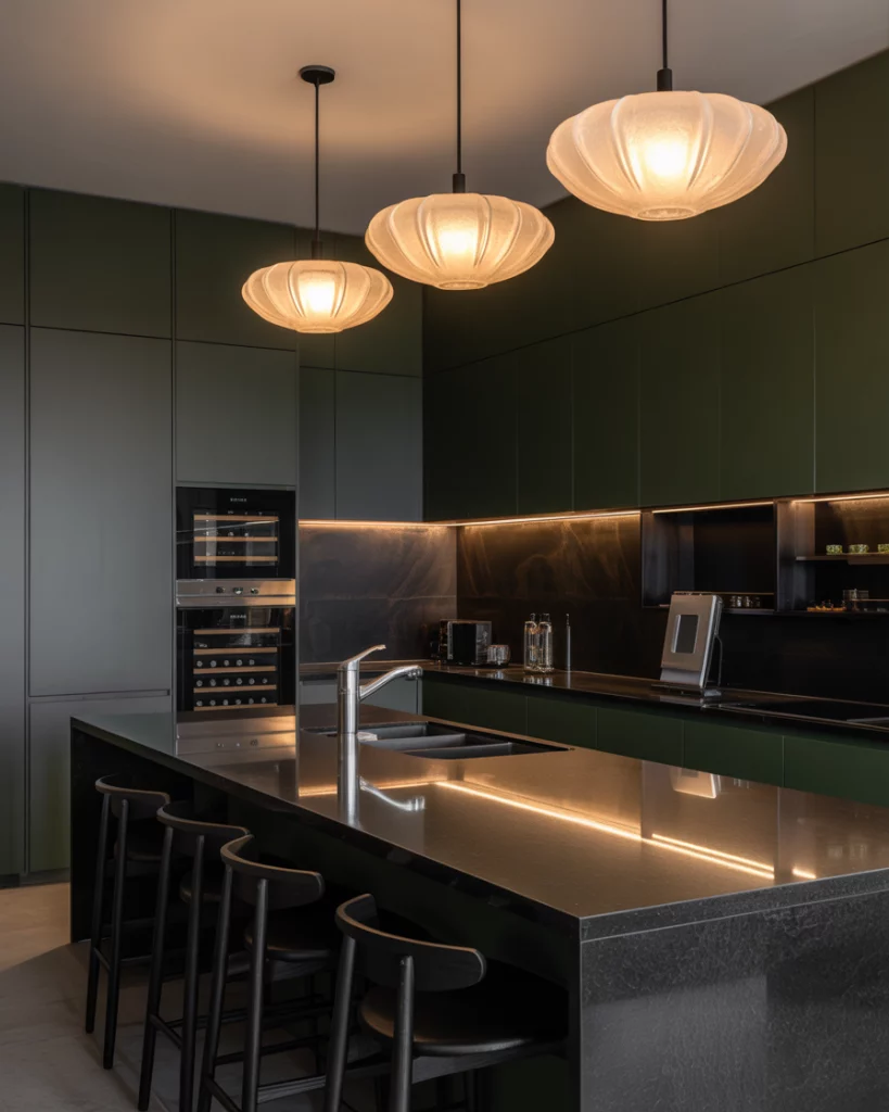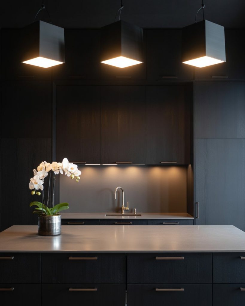 Lighting can transform a dark kitchen. Pendant lamps over an island or dramatic fixtures above a table add inspiration and personality. Pair black cabinets with brass hardware and bold decor to create balance. Integrated under-cabinet lights enhance countertops and elevate appliances. The aesthetic is bold but practical, perfect for all modern homes.