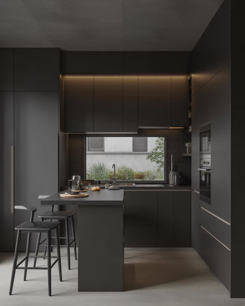 Black works even in small apartments if balanced with light accessories and reflective countertops. A compact island doubles as a table, making smart use of space. Pair with slimline appliances, a black sink, and light-toned hardware. The result is a functional design that feels chic without overwhelming the room.