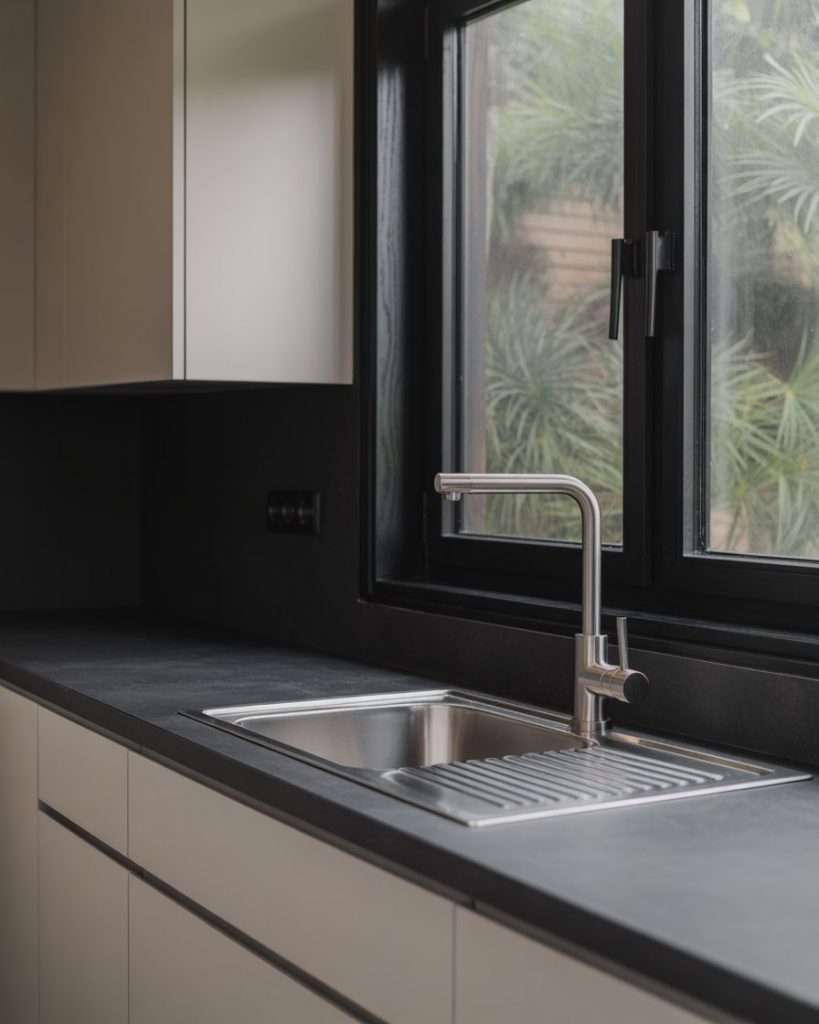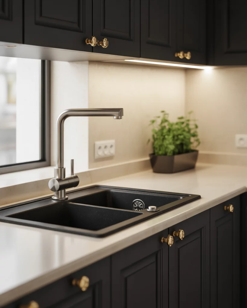 The blend of black cabinetry with cream and neutral walls is a subtle way to achieve luxury without overdoing it. This approach creates depth and adds visual softness while keeping the design bold. Pairing a dark sink with soft cream countertops balances light and shadow perfectly. Add golden hardware and refined accessories for a welcoming atmosphere that feels both modern and classic.