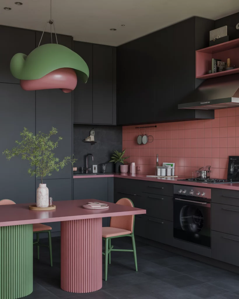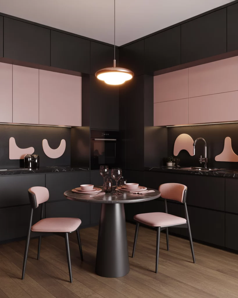 The combination of pink and black might sound unconventional, but it has become a playful trend embraced by top design bloggers. Black cabinets paired with soft blush countertops or decor accents bring personality and warmth. Add a blush table or subtle pastel accessories for charm. This pairing is especially appealing for younger homeowners who want inspiration that breaks away from tradition.