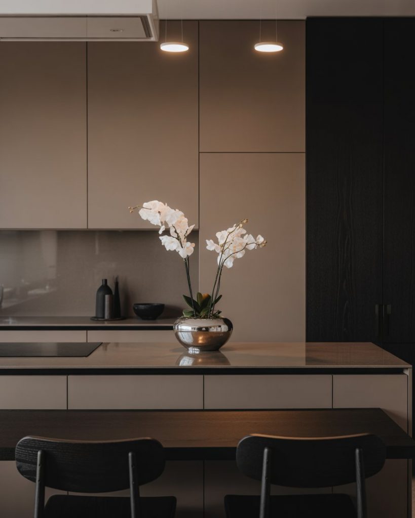 The mix of taupe and black offers a chic middle ground for those who want neither stark contrast nor full darkness. Black countertops with taupe cabinets ideas look refined and versatile. A taupe table with matte black decor elements creates an elegant modern aesthetic. As seen in Elle Décor features, this pairing fits seamlessly in open-plan homes.