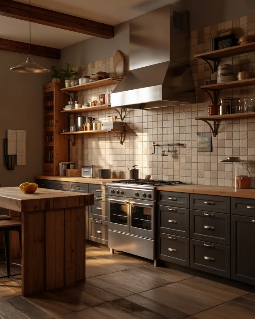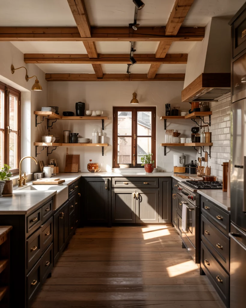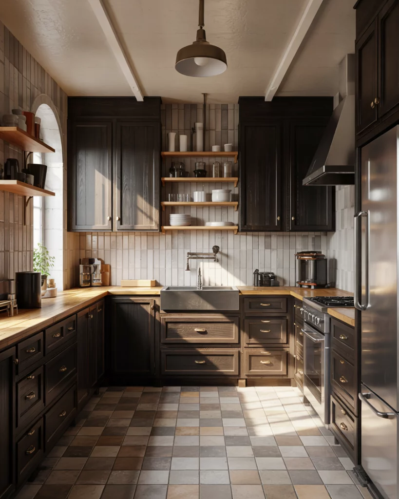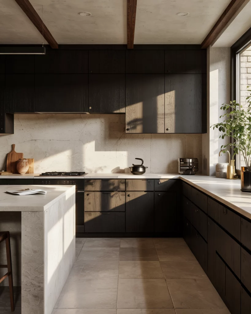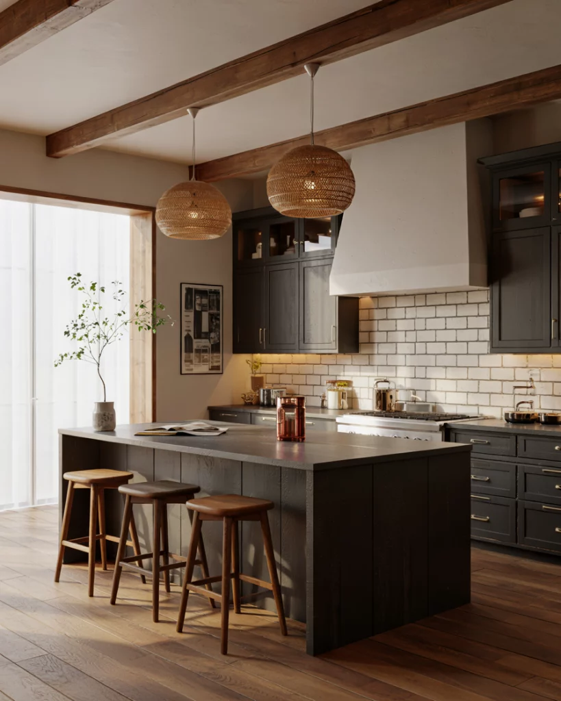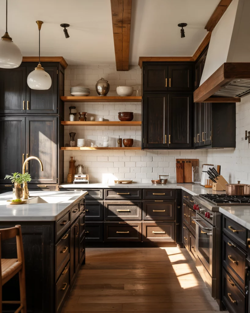Matte black cabinets ground a space instantly, but pairing them with touches of wood gives the palette warmth. A rustic mix works beautifully here, especially when balanced with white countertops or a contrasting wood countertop. The look is clean, cozy, and deeply inviting—ideal for homeowners who want a dark kitchen without losing that comforting glow. Adding rustic elements is especially useful in American homes where open-concept living makes warmth essential. The blend helps the kitchen feel integrated with living areas rather than stark or overly modern, a priority for many families who prefer a softer visual transition.