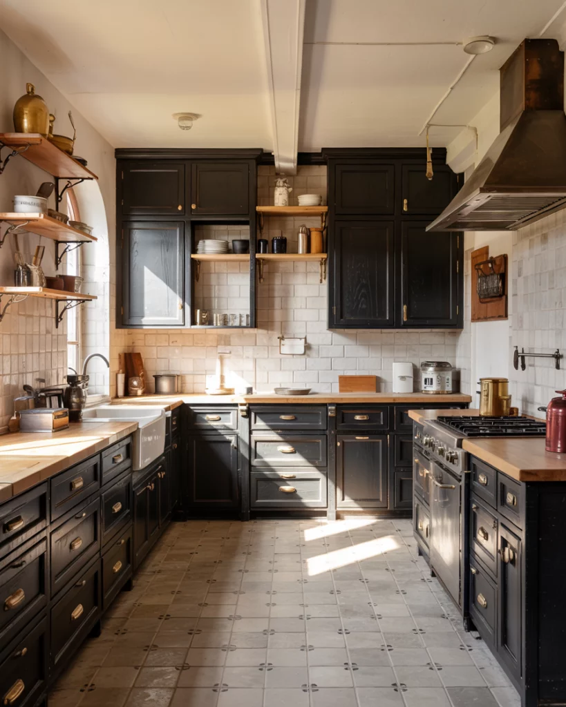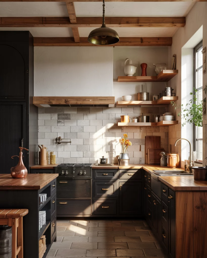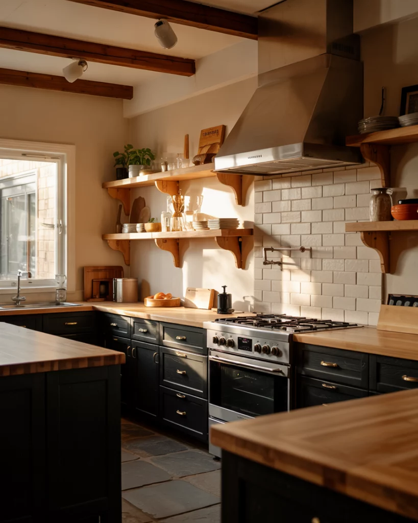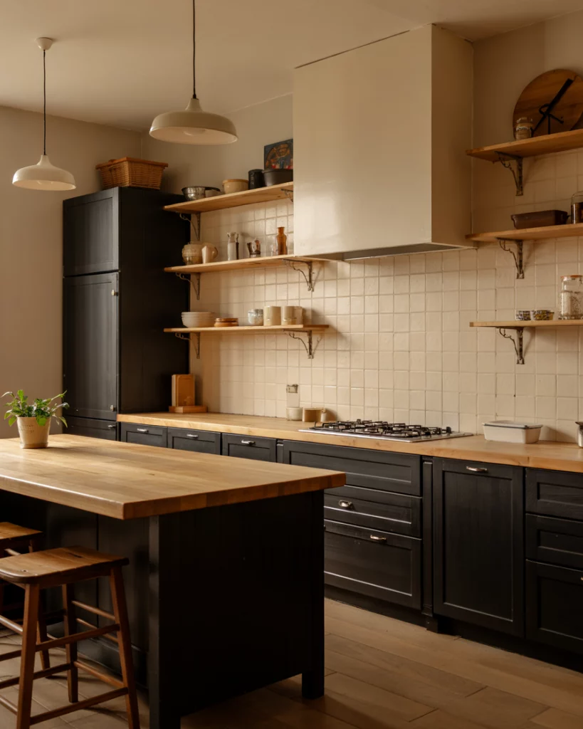 For a warm-meets-moody look, pairing black cabinetry with rich butcher block countertops can feel both artisanal and contemporary. Bringing in touches of rustic texture—like open wood shelves—gives the composition an inviting coziness. This mix works well in kitchens that want the visual depth of black without sacrificing natural warmth. This pairing thrives in kitchens that receive steady natural light, which brings the wood’s natural warmth forward and prevents the cabinetry from feeling too heavy.