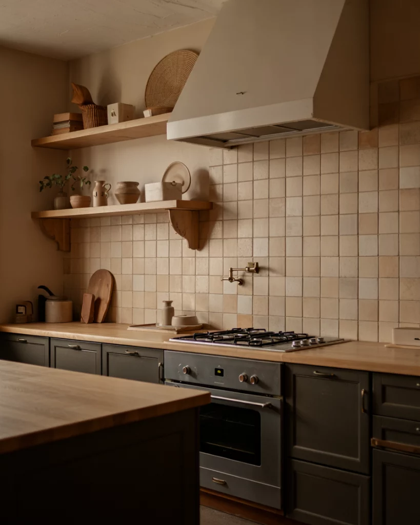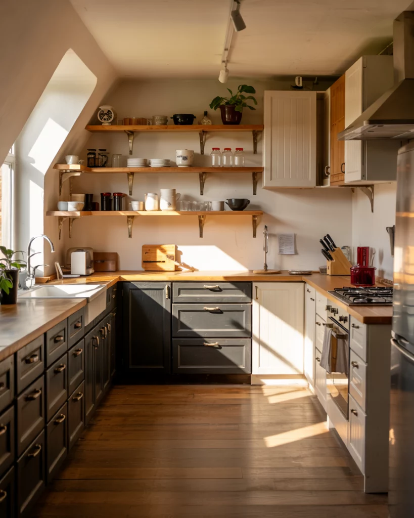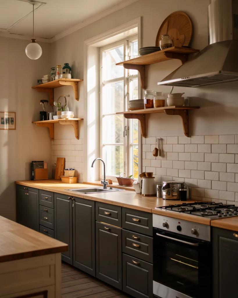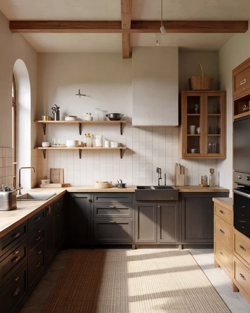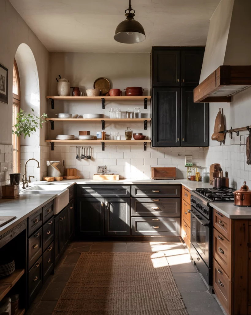 For a warm-meets-moody look, pairing black cabinetry with rich butcher block countertops can feel both artisanal and contemporary. Bringing in touches of rustic texture—like open wood shelves—gives the composition an inviting coziness. This mix works well in kitchens that want the visual depth of black without sacrificing natural warmth. This pairing thrives in kitchens that receive steady natural light, which brings the wood’s natural warmth forward and prevents the cabinetry from feeling too heavy.