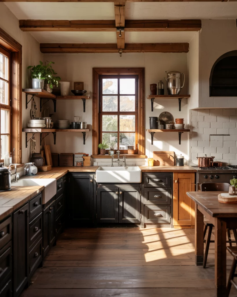 Black cabinetry blends surprisingly well with farmhouse features when balanced with natural textures. Think soft wood shelving, light stone counters, and handcrafted details. Bringing in wood and metal accents helps the space feel authentic yet updated. This combination gives a traditional farmhouse kitchen a more contemporary, curated edge. Many farmhouse enthusiasts use black cabinets sparingly at first—often starting with an island—before committing to full walls once they see how rich and balanced the contrast feels.