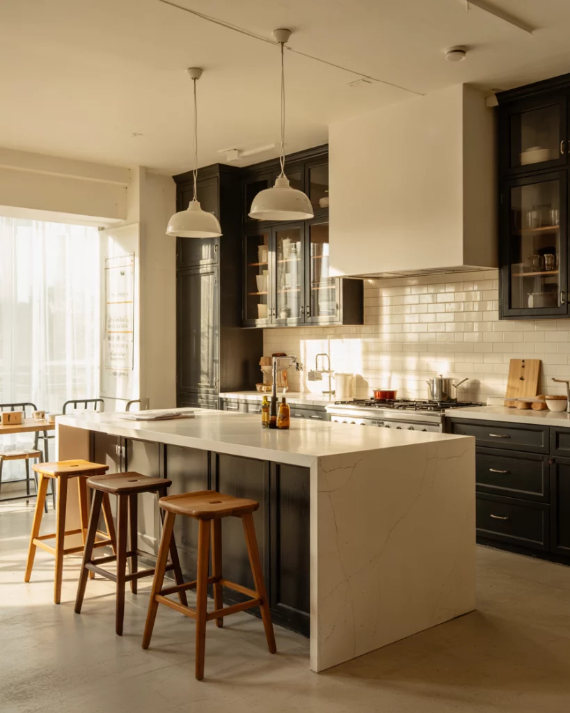 A mix-and-match approach can elevate black cabinetry, especially when incorporating combinations like countertops in contrasting materials. Adding black countertops to a portion of the kitchen while using lighter surfaces elsewhere creates interesting depth. This layered approach feels custom and editorial, perfect for design-forward homeowners. Many mix countertop materials to keep island surfaces durable for heavy use while choosing something lighter and more decorative at the perimeter.