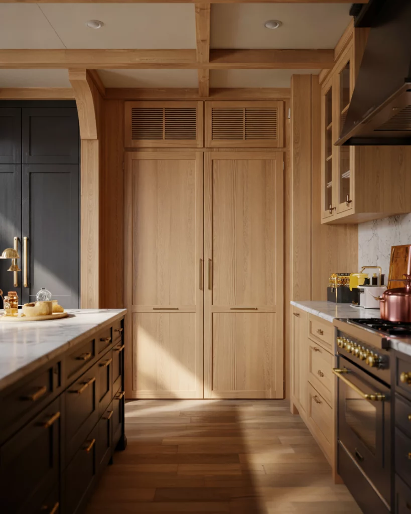 This idea uses black cabinetry as a dramatic base while weaving in white oak trim, shelves, or paneling for contrast. The pairing feels fresh yet timeless. A few touches of gold handles can elevate the look without overwhelming it. The style leans modern farmhouse but with a cleaner, more architectural feel perfect for today’s design lovers. Designers often lean on white oak because it naturally softens the depth of black. Its grain brings needed texture and prevents the cabinetry from feeling too monolithic, giving the room character even when the palette stays neutral.