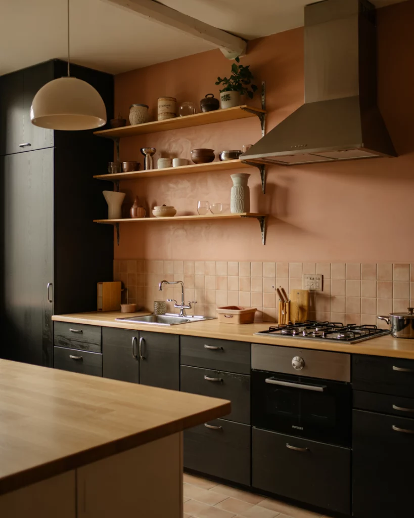 Black cabinetry becomes even more expressive when paired with gentle accent hues. A backdrop of muted colors or soft clay tones adds warmth without dimming the drama. Introducing natural touches like wood counter details or simple styling keeps the balance grounded. This approach suits homeowners who want personality while preserving a calm, cohesive feel. Color through paint and small accessories is far more affordable than replacing cabinets or counters, making this a cost-friendly refresh for those upgrading in stages.