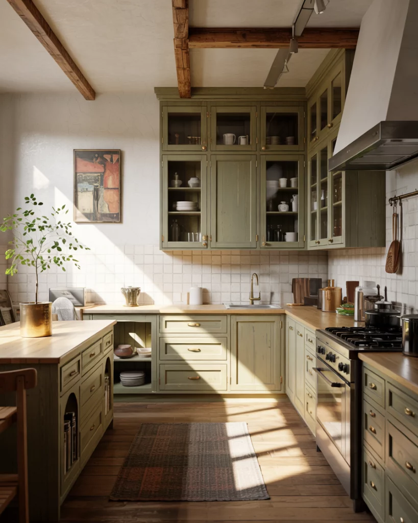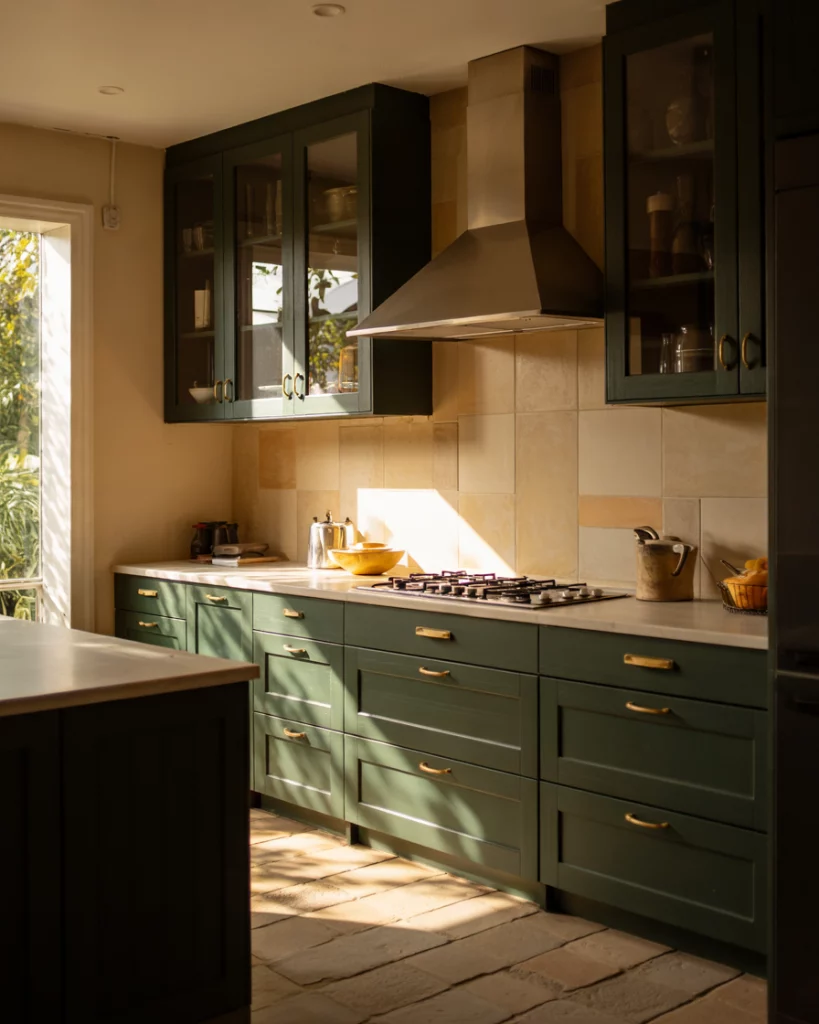 A two-tone palette brings dimension, especially when pairing black uppers with a rich green lower bank. It’s a stylish choice for kitchens with strong natural light. Adding subtle handles in brushed metal or pairing with wood counter details introduces balance. This combination feels earthy yet sophisticated, perfect for creative homeowners. This palette shines in kitchens with generous windows or glass doors. Natural light highlights the depth of the two-tone contrast, preventing the colors from appearing heavy.