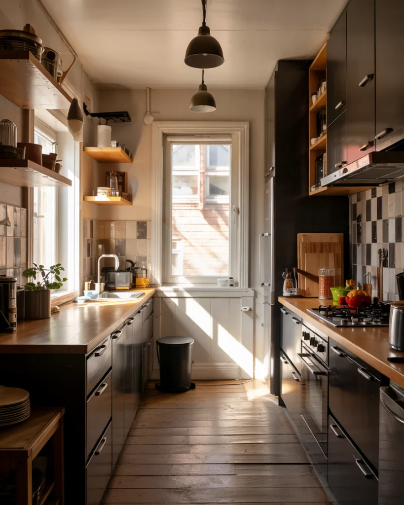 Black cabinetry can transform a small kitchen when paired with reflective surfaces or black countertops that keep the look streamlined. Using narrow hardware and vertical lines creates the illusion of height. The result is a compact space that feels intentional and polished rather than cramped or overly busy. In small spaces, consistency matters. Keeping counters, cabinets, and hardware within a limited tonal range makes the room feel cohesive and larger than it is.
