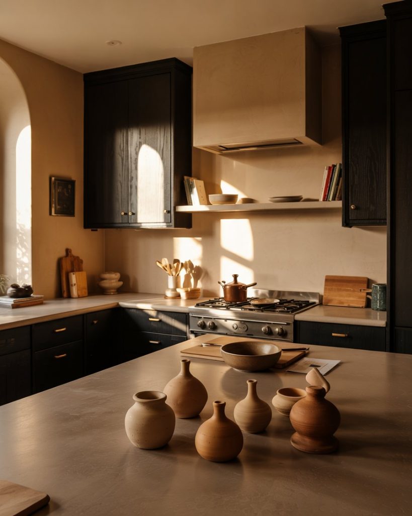 For a softer, earth-centered aesthetic, black cabinets can be paired with organic materials and subtle colors. Incorporating stained wood elements or clay-toned ceramics enriches the look. This palette feels timeless—simple yet fully connected to natural textures that resonate across contemporary American design. A homeowner in Santa Fe shared that adding clay-tone ceramics on open shelves softened the black cabinetry instantly, giving the room an inviting, lived-in feel.