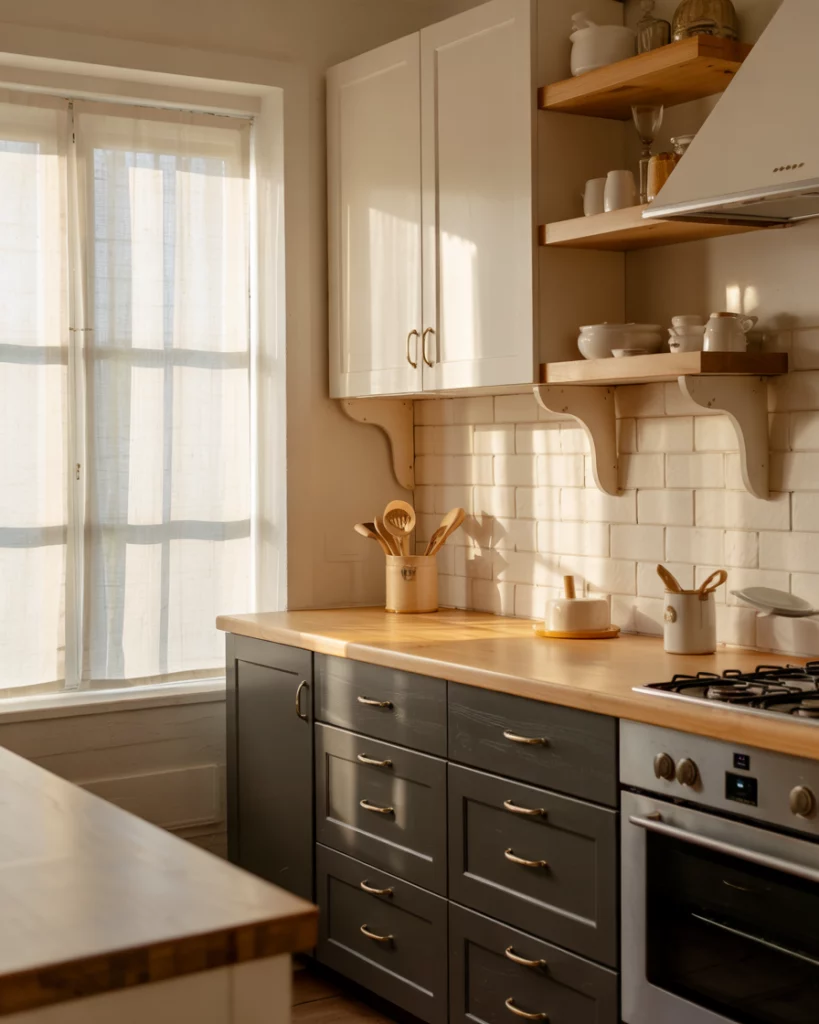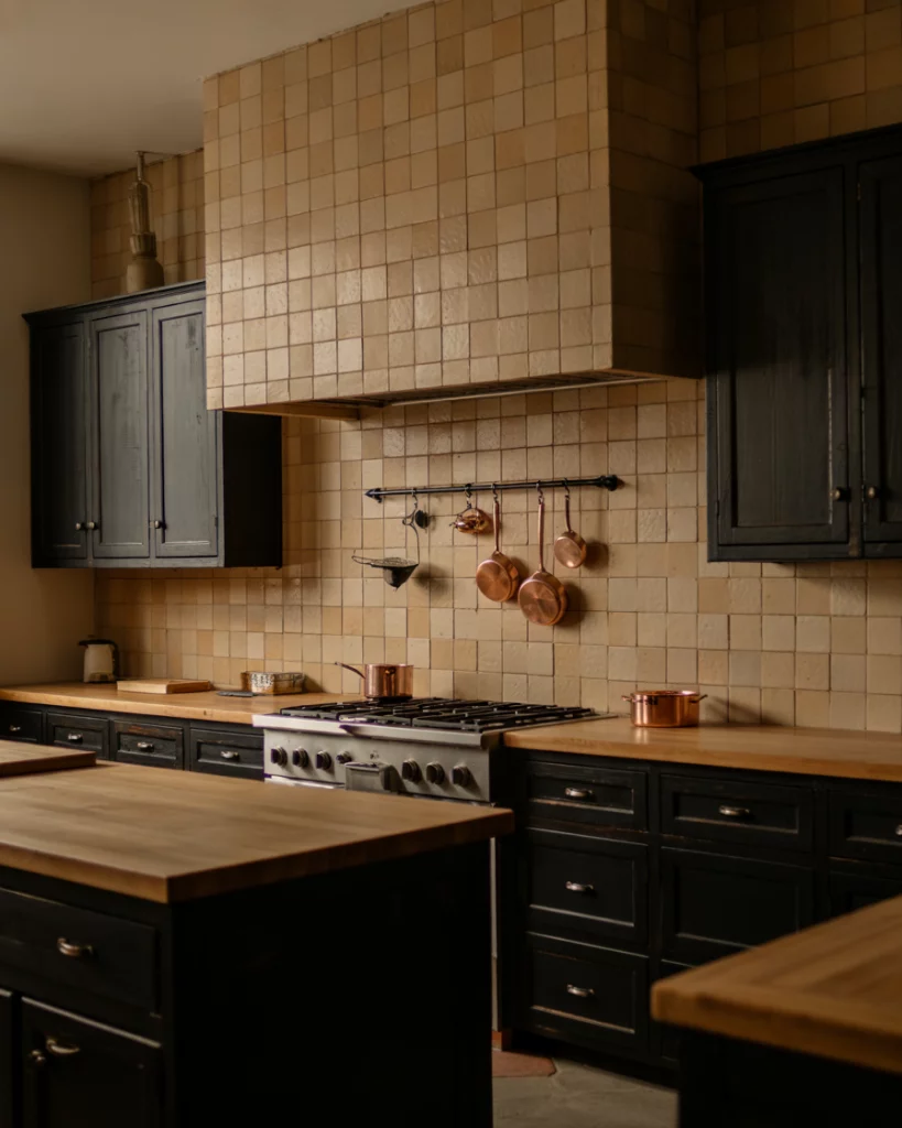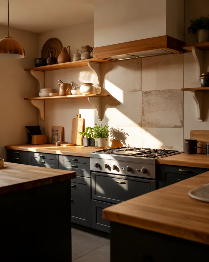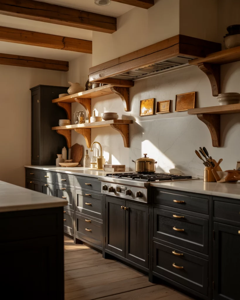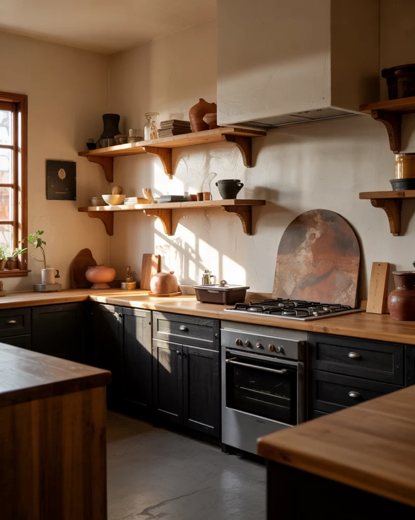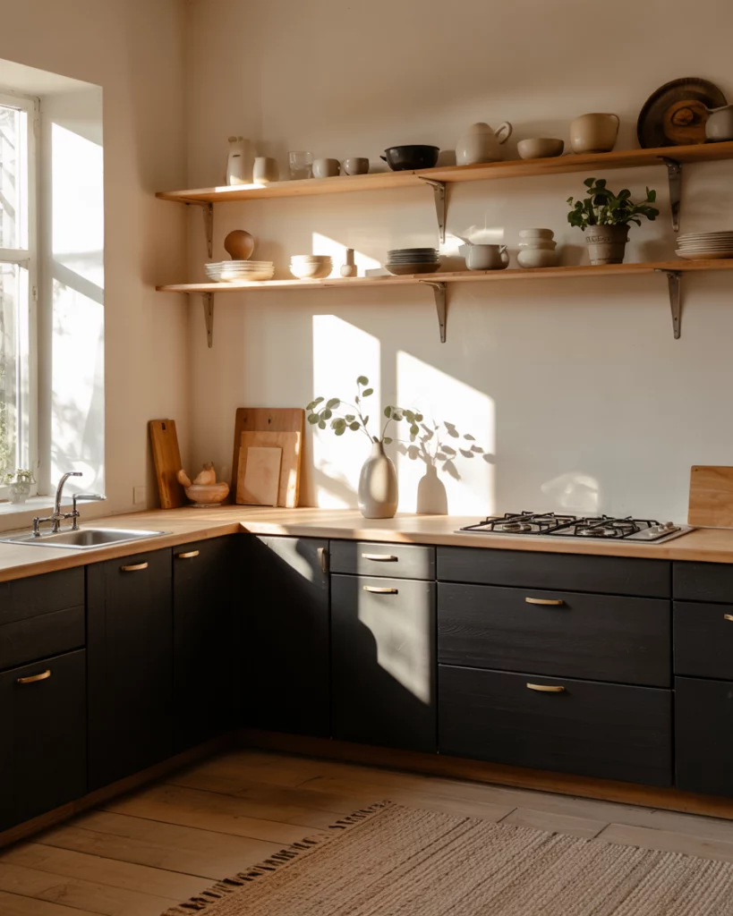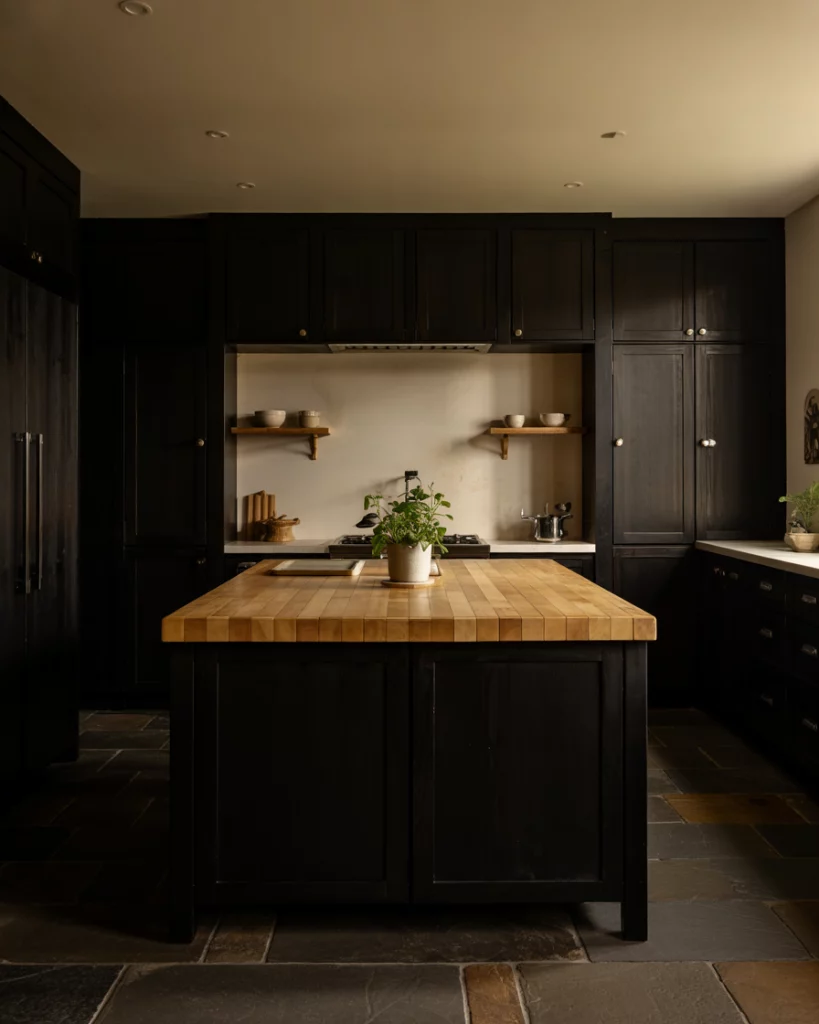 For a warm-meets-moody look, pairing black cabinetry with rich butcher block countertops can feel both artisanal and contemporary. Bringing in touches of rustic texture—like open wood shelves—gives the composition an inviting coziness. This mix works well in kitchens that want the visual depth of black without sacrificing natural warmth. This pairing thrives in kitchens that receive steady natural light, which brings the wood’s natural warmth forward and prevents the cabinetry from feeling too heavy.