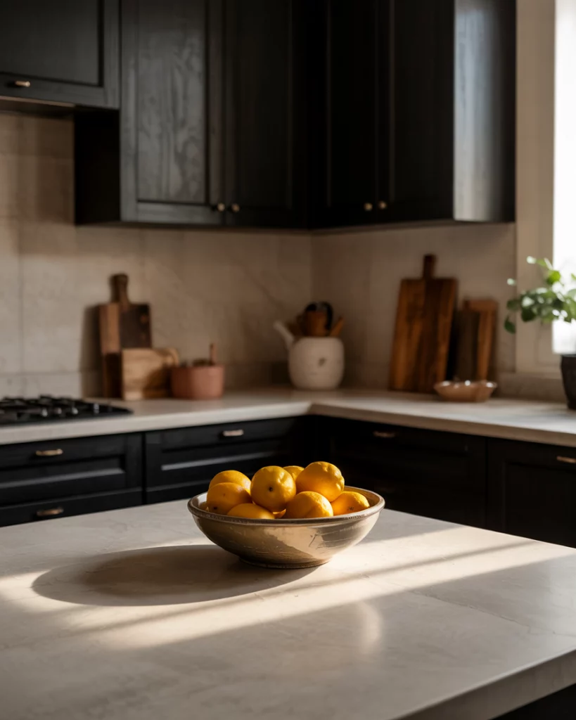For those who love dramatic contrast, pairing black cabinets with crisp white countertops delivers a bright yet bold expression. Introducing subtle accents such as decor ideas in warm materials prevents the palette from feeling stark. This high-contrast pairing works beautifully in both small and expansive kitchens. Many homeowners opt for white counters because they brighten the space for everyday cooking, especially in regions with long winter months where natural light is limited.