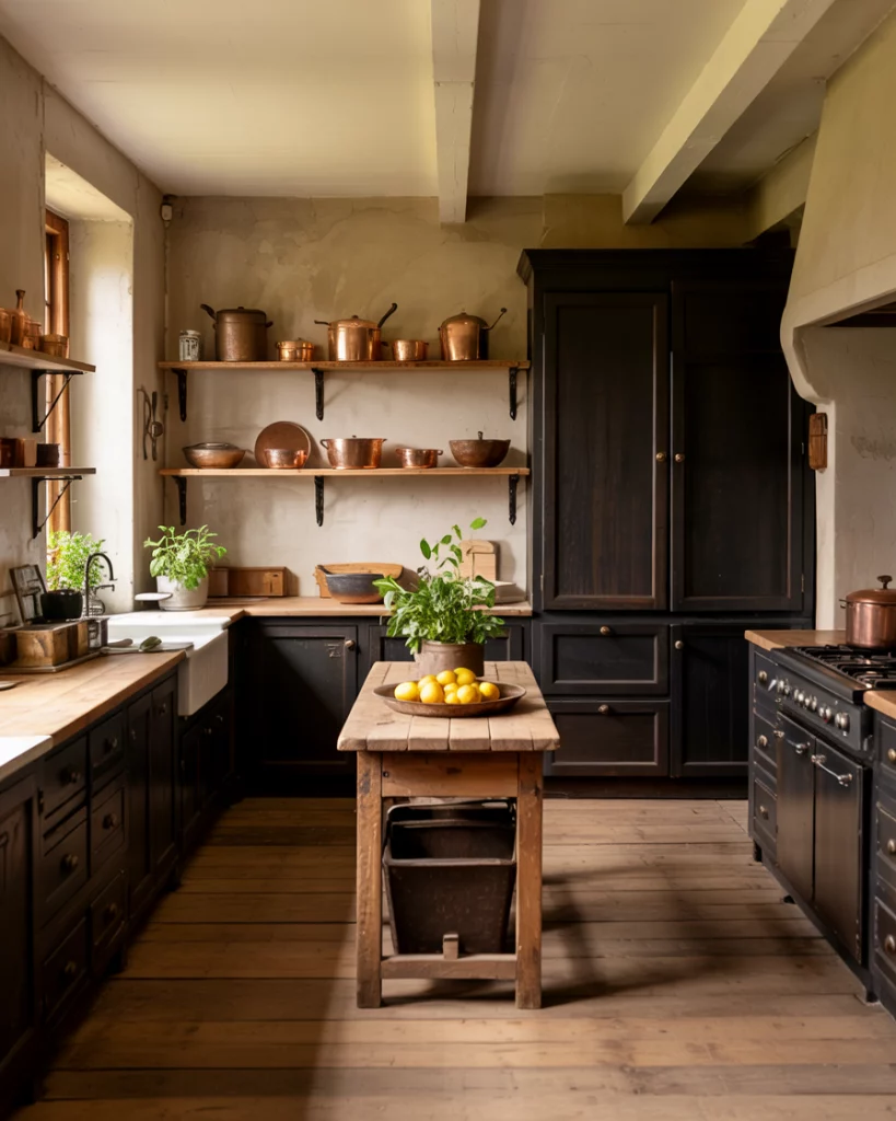 Black cabinetry blends surprisingly well with farmhouse features when balanced with natural textures. Think soft wood shelving, light stone counters, and handcrafted details. Bringing in wood and metal accents helps the space feel authentic yet updated. This combination gives a traditional farmhouse kitchen a more contemporary, curated edge. Many farmhouse enthusiasts use black cabinets sparingly at first—often starting with an island—before committing to full walls once they see how rich and balanced the contrast feels.