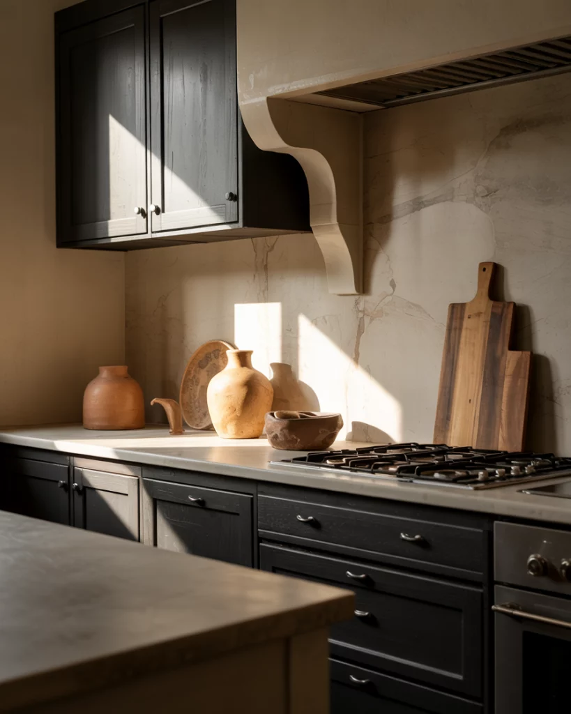 For a softer, earth-centered aesthetic, black cabinets can be paired with organic materials and subtle colors. Incorporating stained wood elements or clay-toned ceramics enriches the look. This palette feels timeless—simple yet fully connected to natural textures that resonate across contemporary American design. A homeowner in Santa Fe shared that adding clay-tone ceramics on open shelves softened the black cabinetry instantly, giving the room an inviting, lived-in feel.