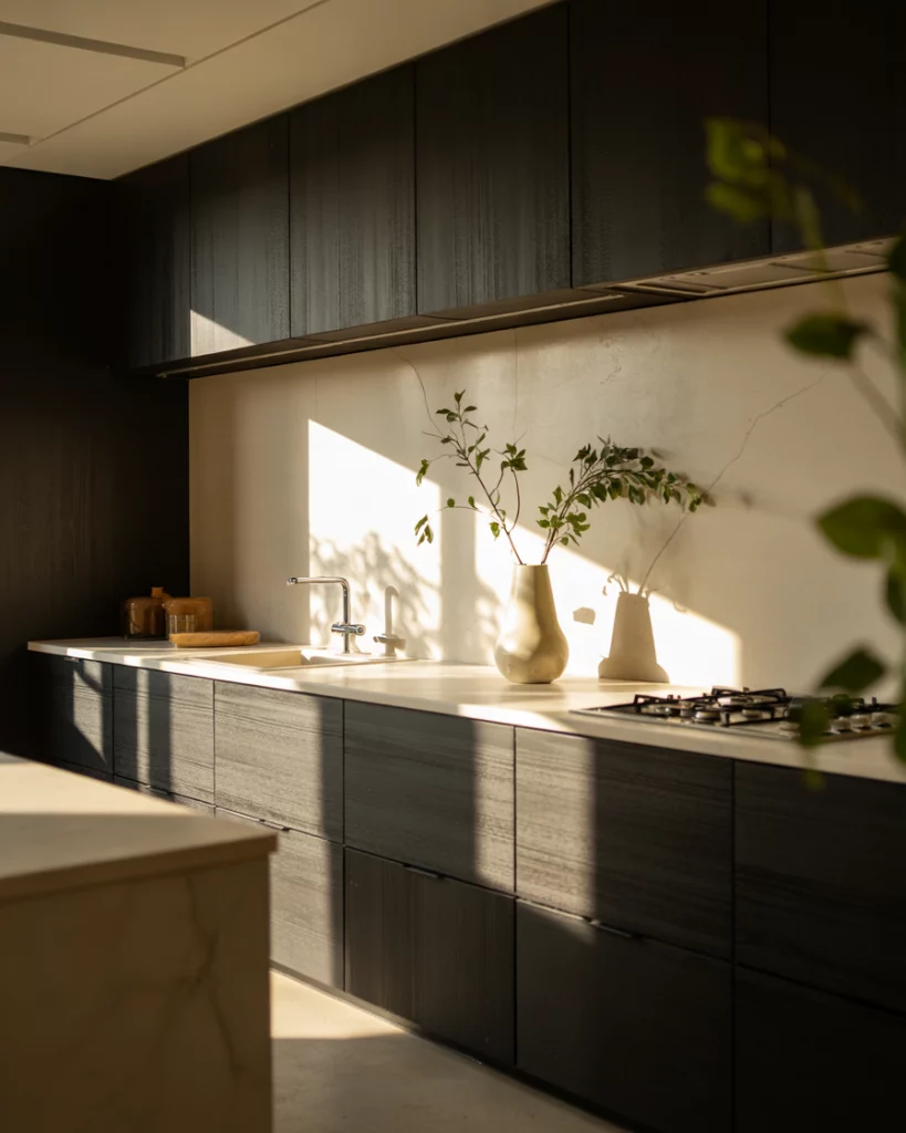 If you’re looking for a gentler expression of the trend, pairing black cabinets with taupe and warm neutrals offers a sophisticated alternative. Integrating stained wood shelves or trim adds texture without disrupting the minimal palette. The result is elegant, calm, and inviting—ideal for homeowners who prefer subtle depth over bold drama. Choosing taupe that’s too cool can clash with black. Opt for warmer undertones so the palette reads cohesive instead of chalky or flat.