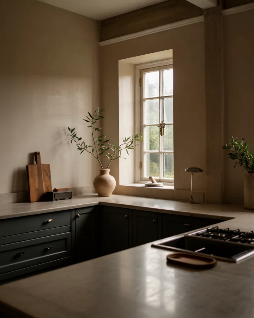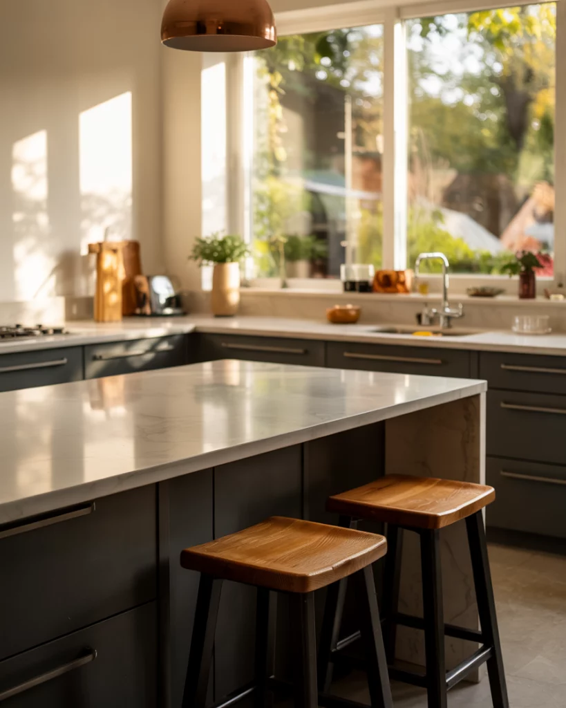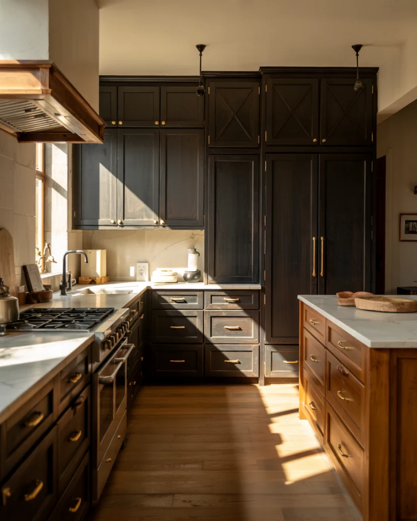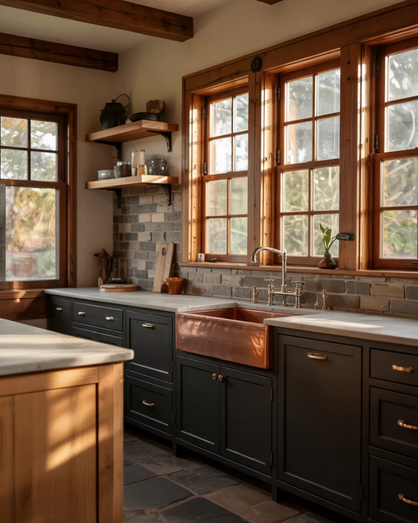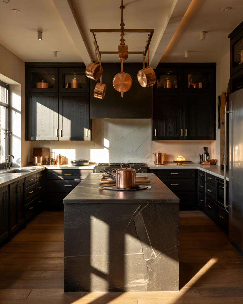 Matte black cabinets ground a space instantly, but pairing them with touches of wood gives the palette warmth. A rustic mix works beautifully here, especially when balanced with white countertops or a contrasting wood countertop. The look is clean, cozy, and deeply inviting—ideal for homeowners who want a dark kitchen without losing that comforting glow. Adding rustic elements is especially useful in American homes where open-concept living makes warmth essential. The blend helps the kitchen feel integrated with living areas rather than stark or overly modern, a priority for many families who prefer a softer visual transition.