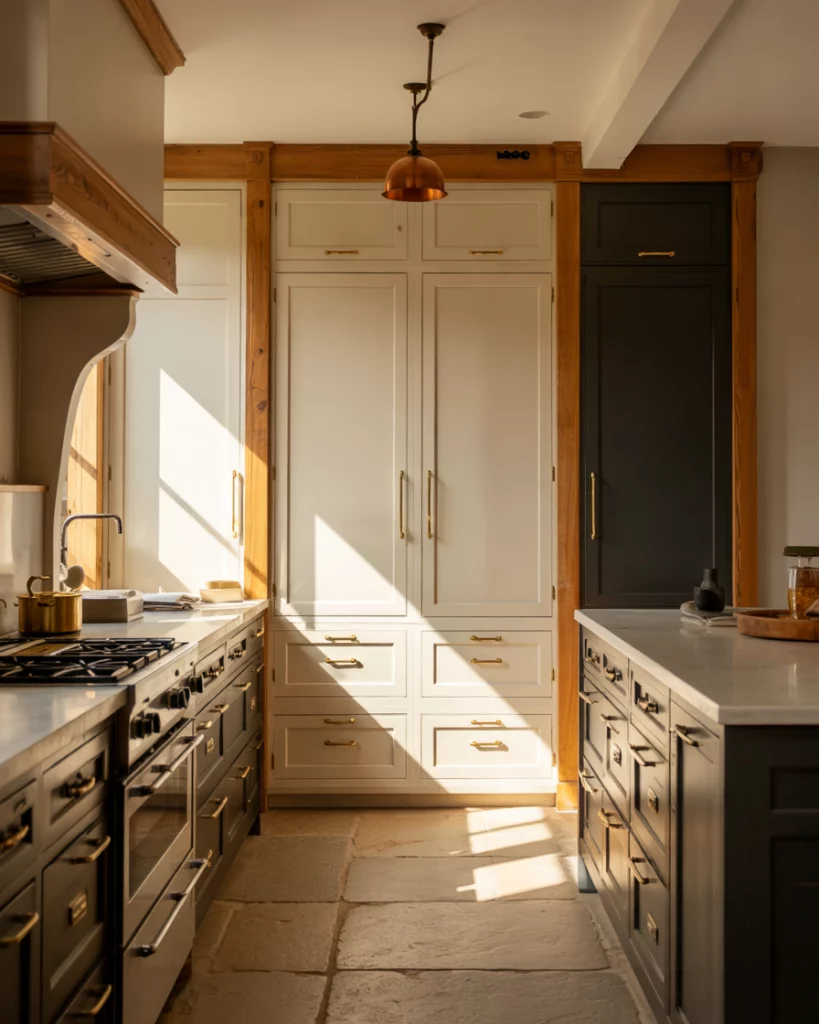 This idea uses black cabinetry as a dramatic base while weaving in white oak trim, shelves, or paneling for contrast. The pairing feels fresh yet timeless. A few touches of gold handles can elevate the look without overwhelming it. The style leans modern farmhouse but with a cleaner, more architectural feel perfect for today’s design lovers. Designers often lean on white oak because it naturally softens the depth of black. Its grain brings needed texture and prevents the cabinetry from feeling too monolithic, giving the room character even when the palette stays neutral.