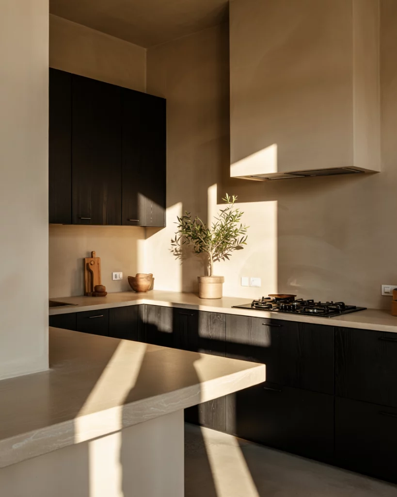 For those who love contrast but prefer gentler transitions, pairing black cabinetry with soft neutrals like beige and warm undertones creates a relaxing palette. Adding subtle texture through butcher block counters or warm wood accents helps the kitchen feel grounded. This mix is especially pleasant in homes that aim for cozy modern elegance. Homes with warm natural light—particularly those facing east or west—benefit from this palette because it enhances the subtle beige undertones and keeps black from feeling overly intense.