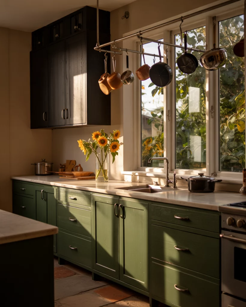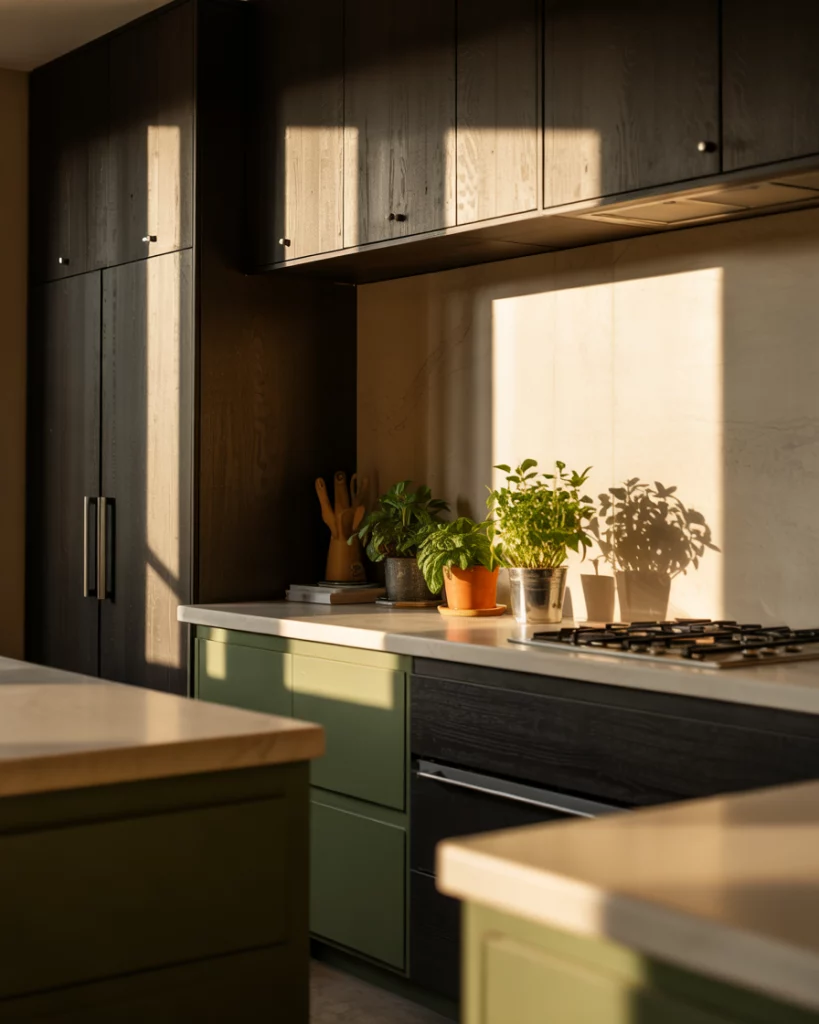 A two-tone palette brings dimension, especially when pairing black uppers with a rich green lower bank. It’s a stylish choice for kitchens with strong natural light. Adding subtle handles in brushed metal or pairing with wood counter details introduces balance. This combination feels earthy yet sophisticated, perfect for creative homeowners. This palette shines in kitchens with generous windows or glass doors. Natural light highlights the depth of the two-tone contrast, preventing the colors from appearing heavy.