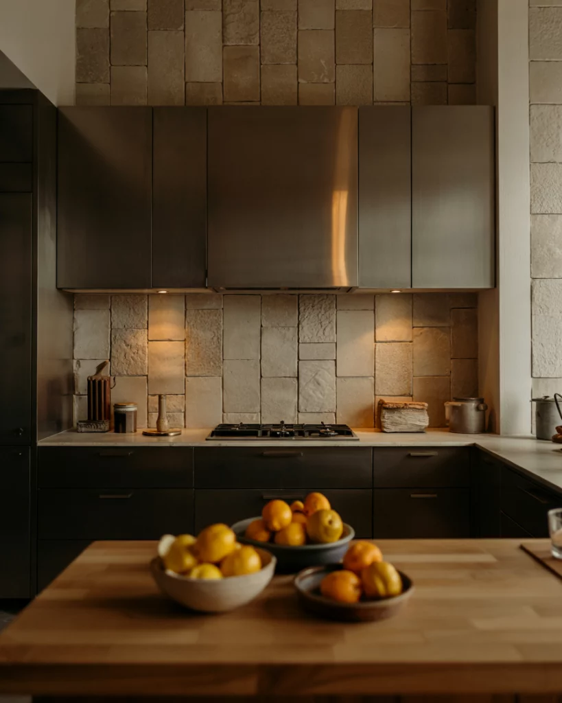 Adding a deeply textured backsplash behind black cabinetry brings dimension and drama. Pairing the setup with decor that incorporates natural materials helps the vignette feel cohesive. Choosing accents in brown and warm tones ties everything together without overwhelming the room. It’s a bold but grounded look that photographs beautifully. Textured surfaces work well with black because they reflect light differently at every angle, preventing the cabinetry from reading too flat or monolithic.