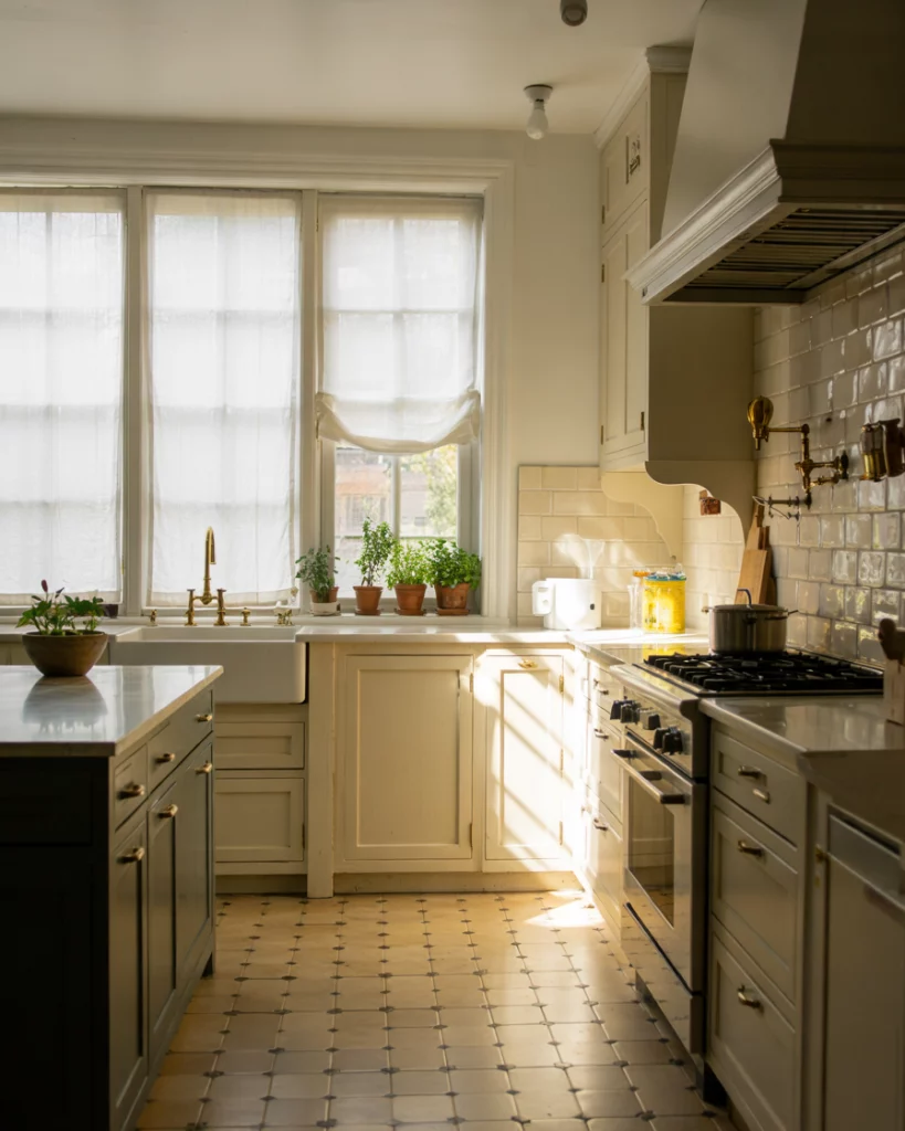 For homeowners wanting crisp contrast, black cabinets alongside a white tile floor create a clean, graphic look. Layering in hardware with a brushed or matte finish keeps the mood refined without leaning too industrial. A light backsplash helps unify the tones, making the whole space feel brighter than you’d expect from dark cabinetry. Many people choose this pairing because it hides dirt surprisingly well—white floors disguise dust, while black cabinets conceal bumps and everyday smudges better than mid-tone colors.