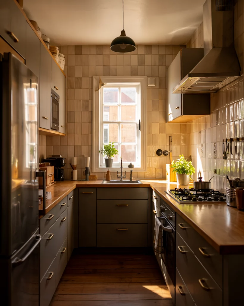 Black cabinetry can transform a small kitchen when paired with reflective surfaces or black countertops that keep the look streamlined. Using narrow hardware and vertical lines creates the illusion of height. The result is a compact space that feels intentional and polished rather than cramped or overly busy. In small spaces, consistency matters. Keeping counters, cabinets, and hardware within a limited tonal range makes the room feel cohesive and larger than it is.