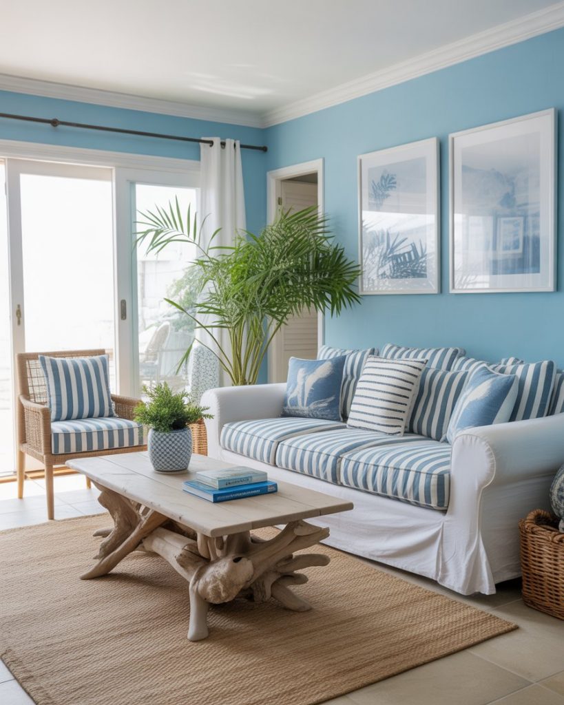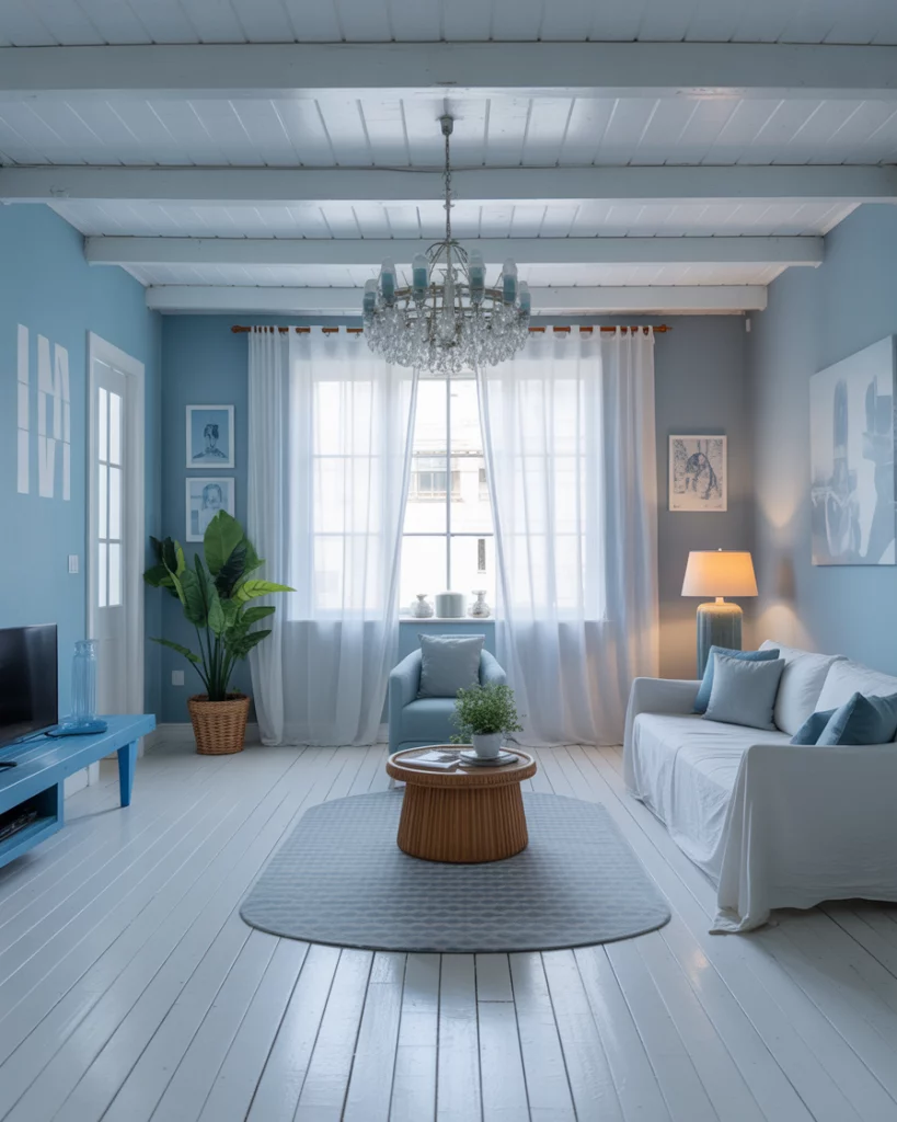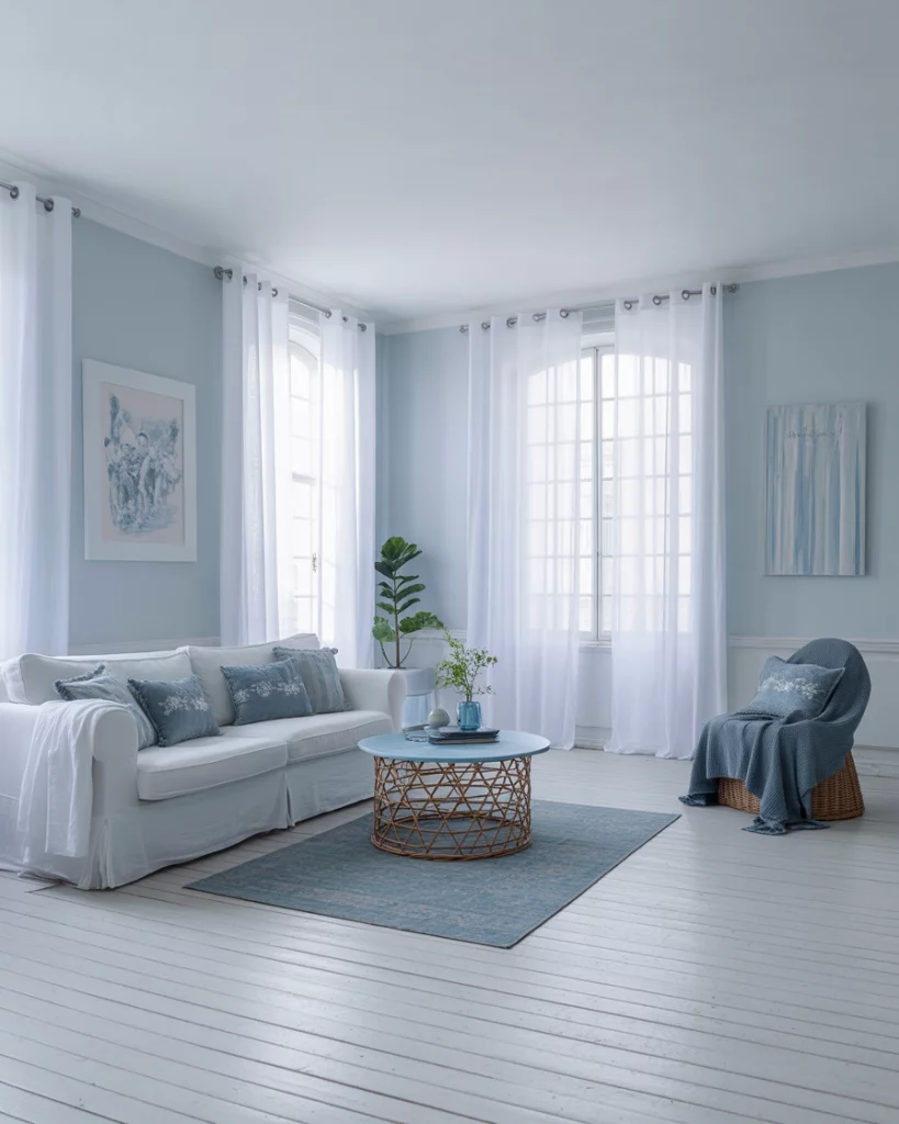 A light blue and white room, flooded with natural light, brings a breath of fresh air—especially in smaller or urban homes. Sheer curtains, whitewashed floors, and pale blue walls make the room feel bigger and brighter. This approach appeals to renters and city dwellers. Look to Apartment Therapy for smart, small-space inspiration.