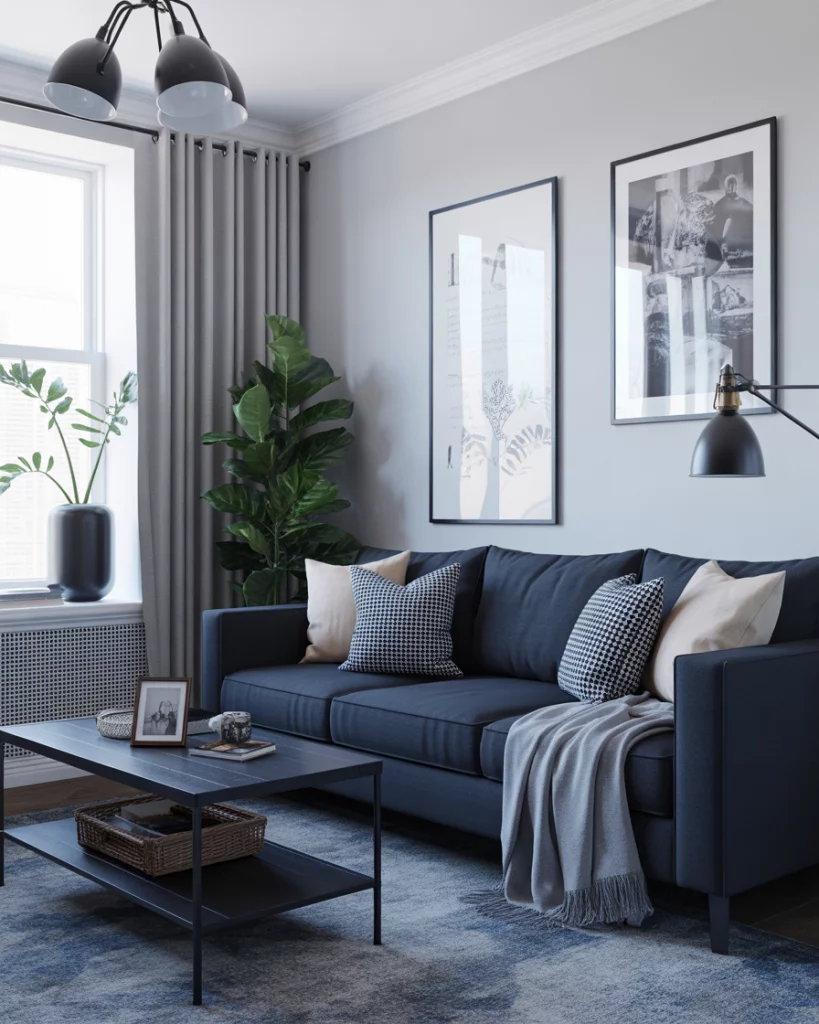 Introduce black elements into your blue and white room for a bold, structured look. Black metal frames, lamps, or trim provide contrast that makes colour palettes pop. This works well in industrial or loft-style living rooms, giving edge without losing the elegance of the blue and white scheme. Inspired by the contrast-rich rooms often found on Houzz.