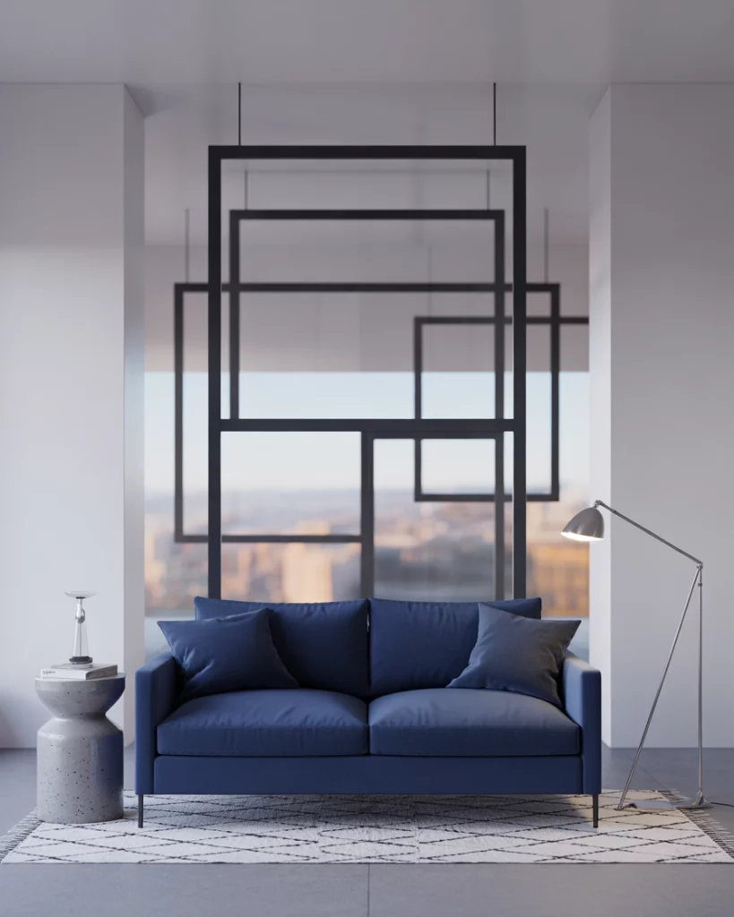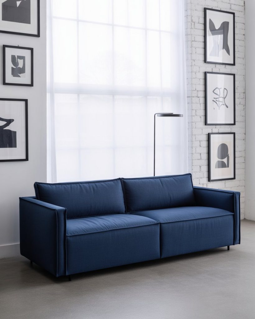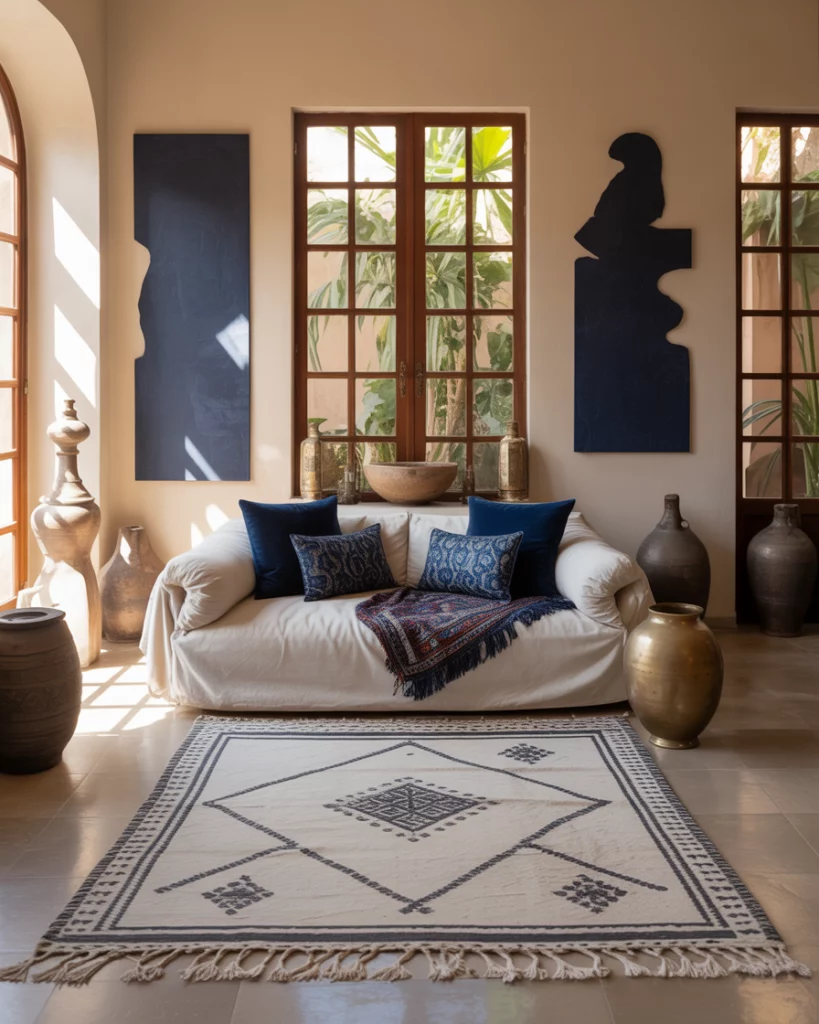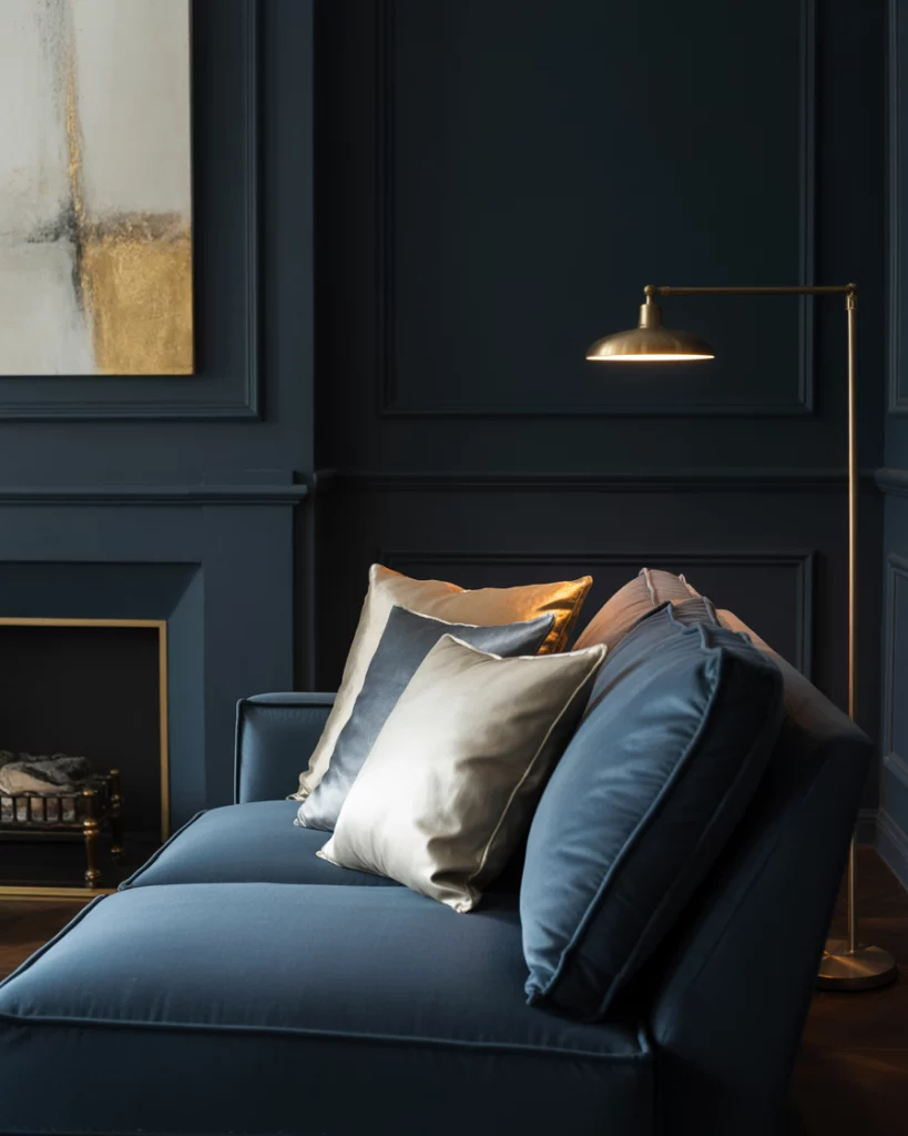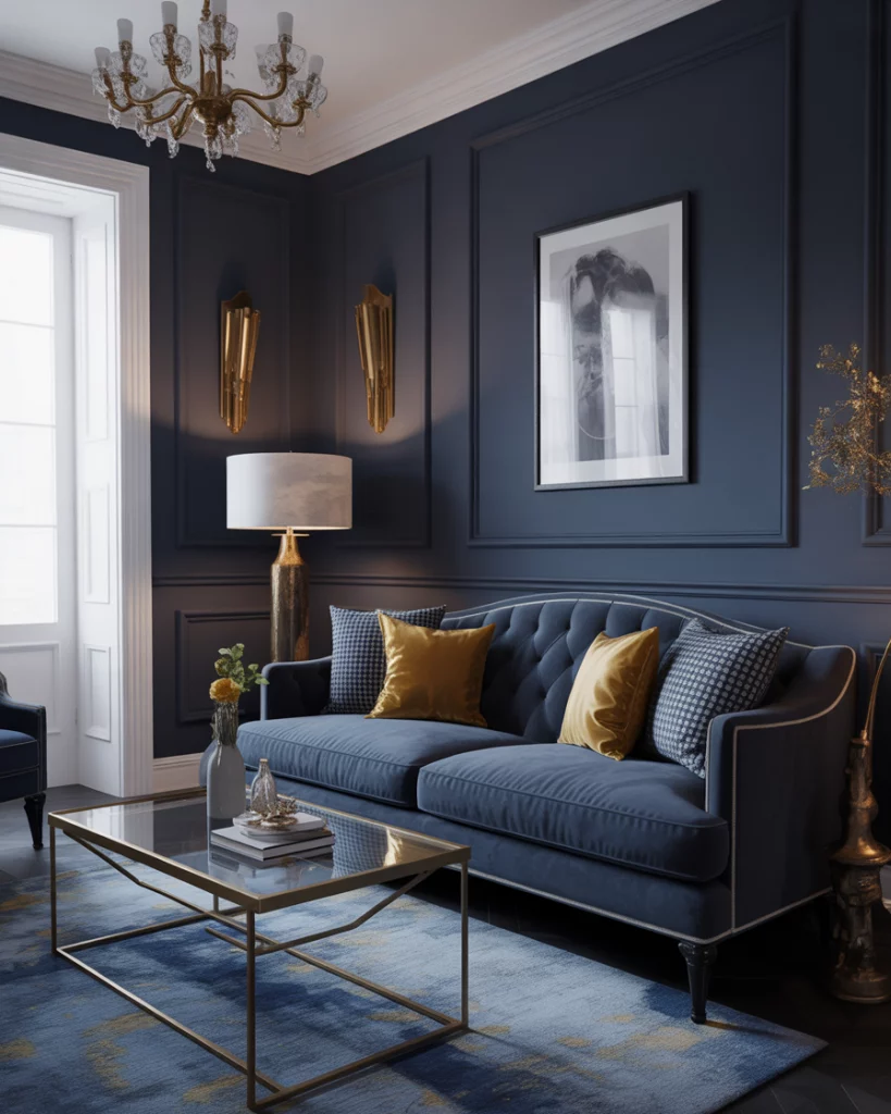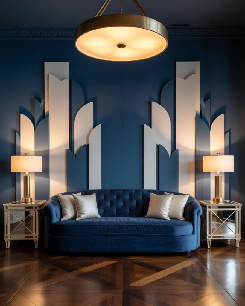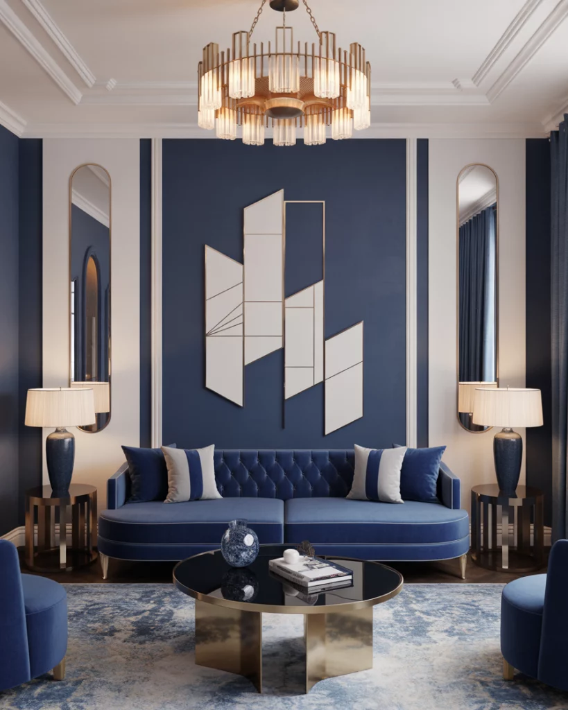 If you love bold geometry and opulence, combine dark navy tones with crisp white and metallic finishes. Use velvet seating, mirrored coffee tables, and brass lighting for an elegant Art Deco statement. This look works especially well in formal spaces or city lofts. Inspired by Kelly Wearstler’s iconic designs, the effect is dramatic yet timeless.