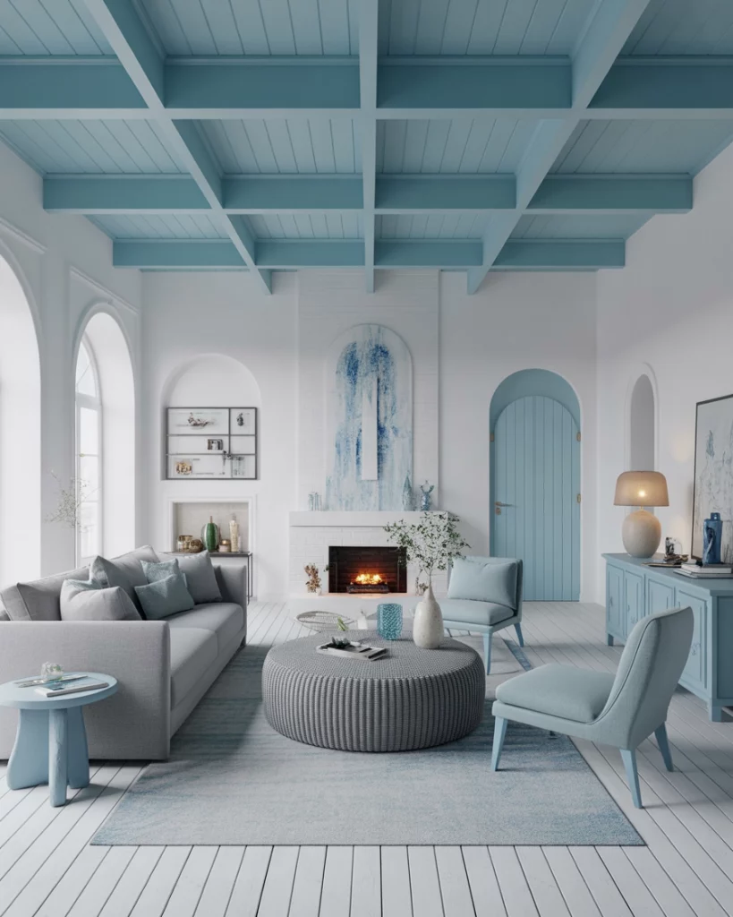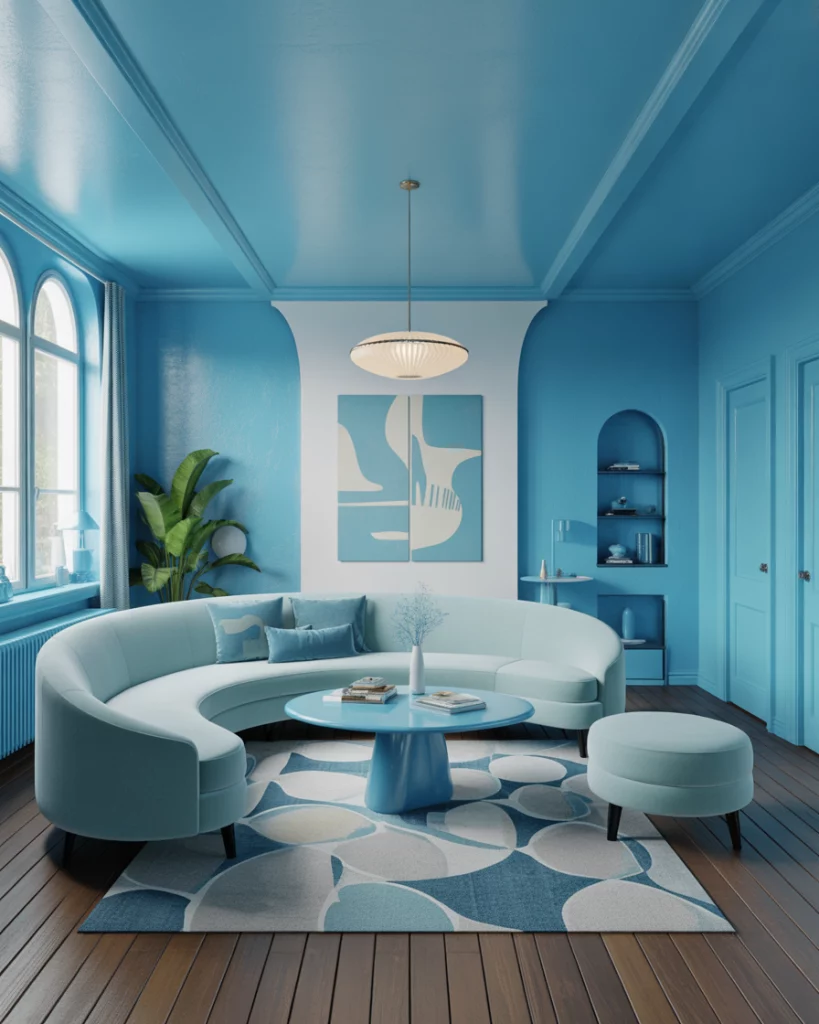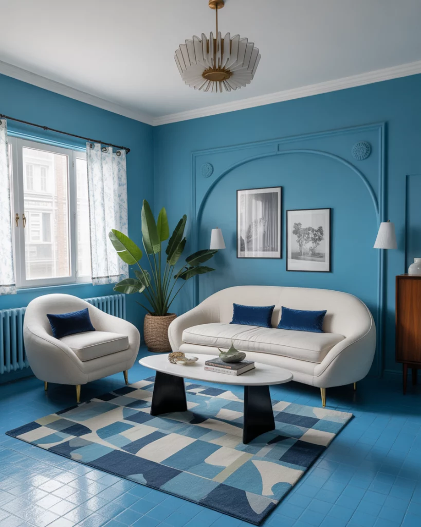 A sky blue and white living room with retro flair brings playful charm and nostalgia. Think curved furniture, mid-century silhouettes, graphic rugs, and bold wall art. Use white as your base and layer in pops of pastel or vintage colour palettes for warmth. This style works beautifully in apartments or homes wanting a burst of personality without sacrificing comfort. Designers like Jonathan Adler embrace this bold yet accessible aesthetic.