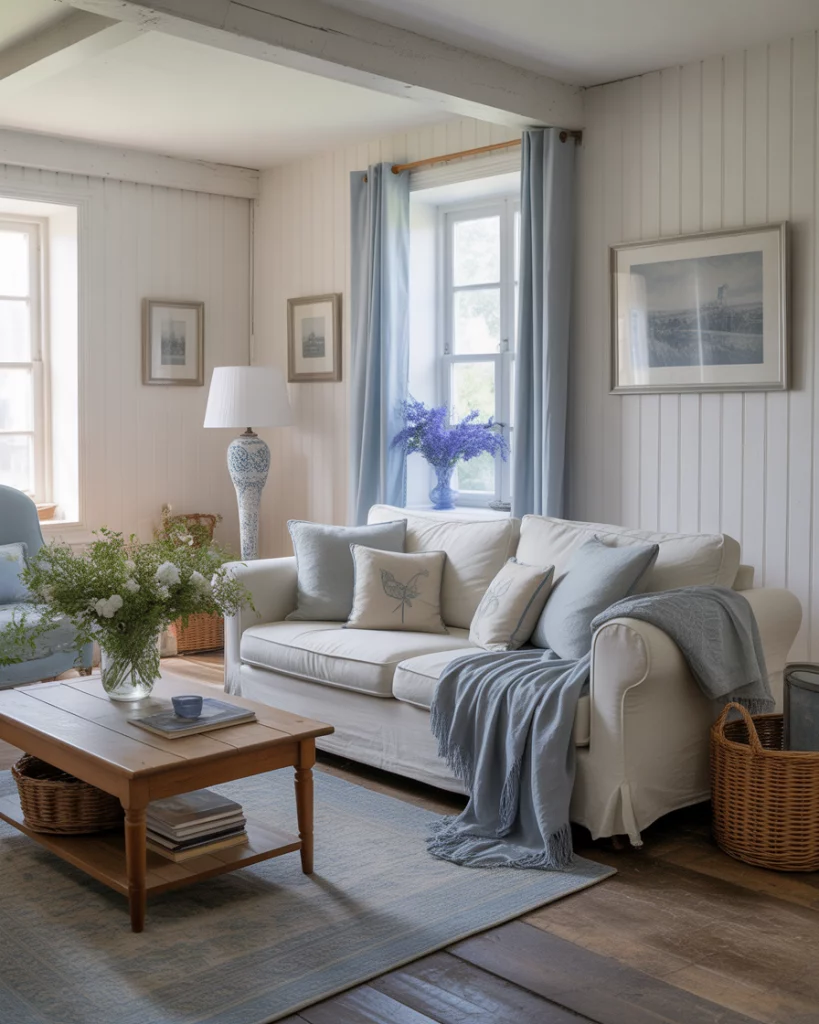 A light blue and white palette with hints of grey suits the cozy charm of a countryside-inspired living room. Think white shiplap walls, linen sofas, soft throws, and natural wood furniture. This is perfect for family homes or anyone looking to create a calm, lived-in atmosphere. Designers like Shea McGee often blend this look with traditional comfort and modern simplicity.