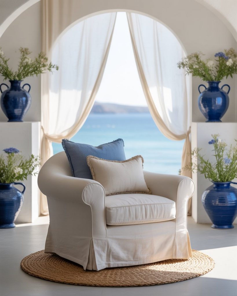 Capture the feeling of a Greek island getaway with crisp white walls, royal blue ceramics, and sun-washed textiles. Add terracotta accents or mosaic patterns to enhance the atmosphere. This coastal Mediterranean style is ideal for open, airy spaces. Athena Calderone’s EyeSwoon projects often feature this warm and breezy design aesthetic.