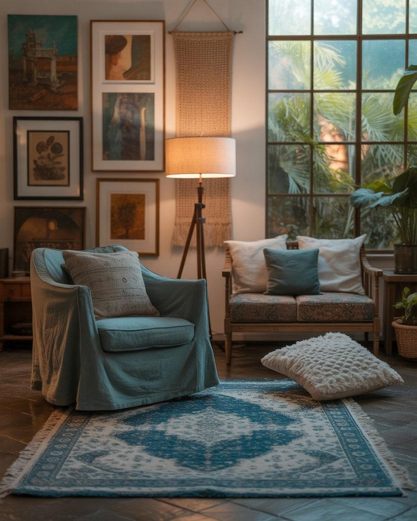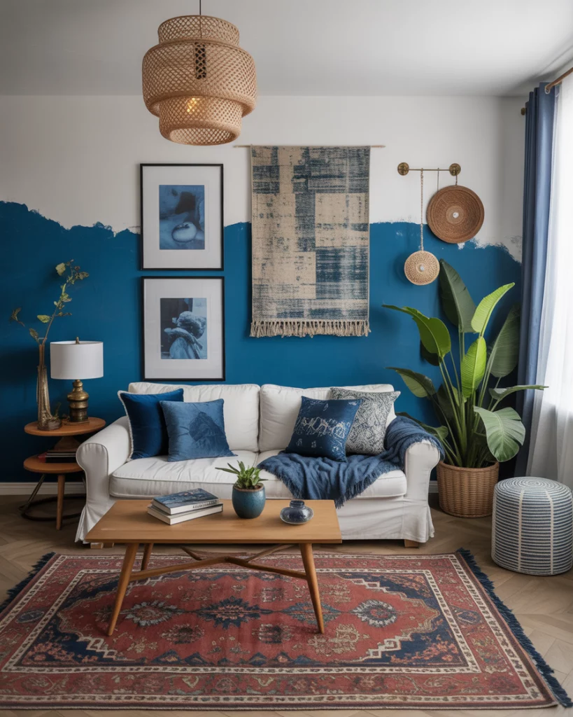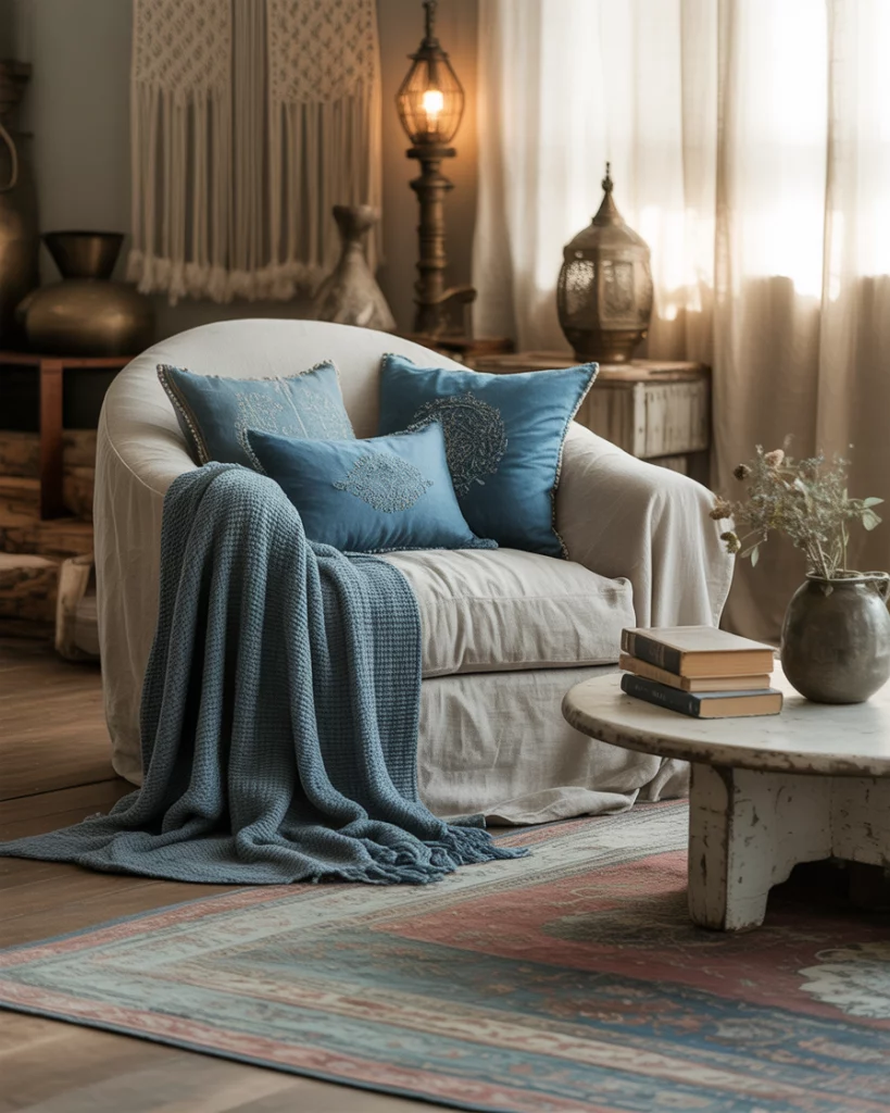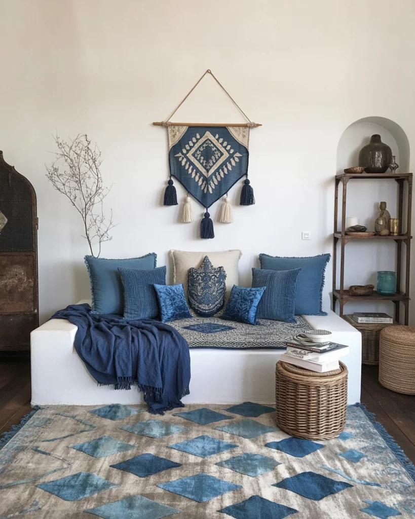 For a more relaxed, personal style, go Bohemian-inspired. Layer textiles in various shades of blue, with patterned cushions, woven throws, and natural elements. The colour palettes can range from dark indigo to sky blue, making the space eclectic and warm. It works beautifully in artistic, lived-in homes. Justina Blakeney’s Jungalow blog is a great reference here.