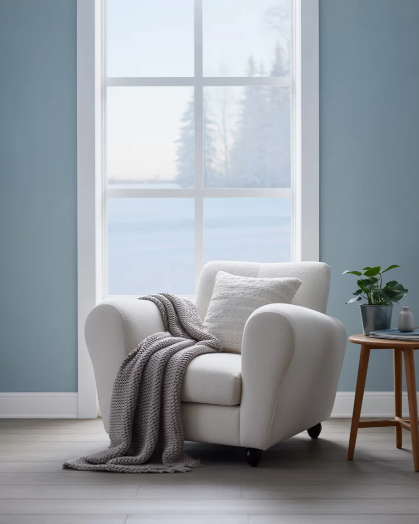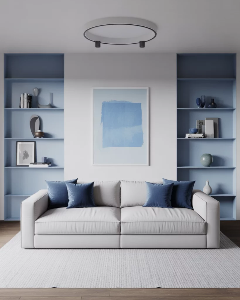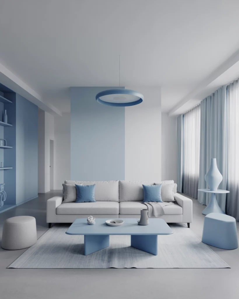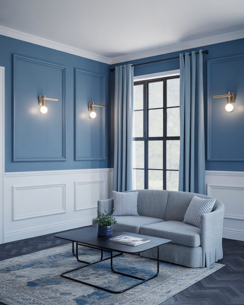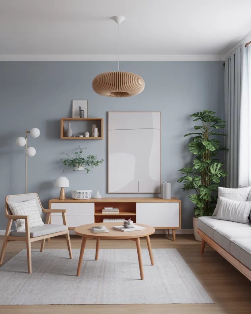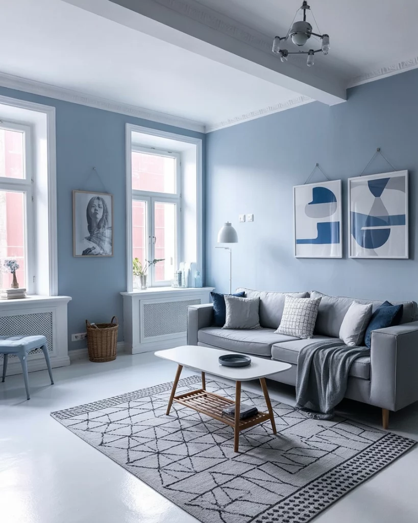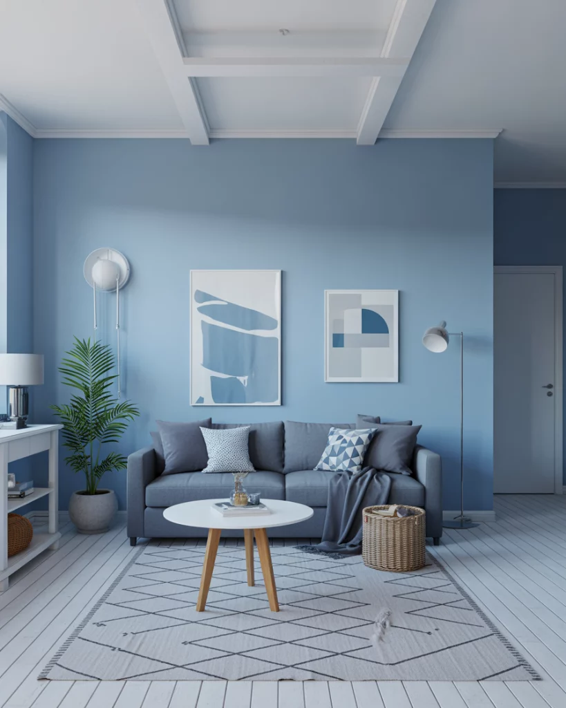 Paint your walls in a soft sky blue and pair with simple Scandinavian-inspired furniture—think blond wood, white accents, and clean lines. Add a textured rug and minimal artwork for interest. It’s a calming, everyday look that works especially well in apartments or modern homes. Refer to Norm Architects or IKEA’s catalog for inspiration.