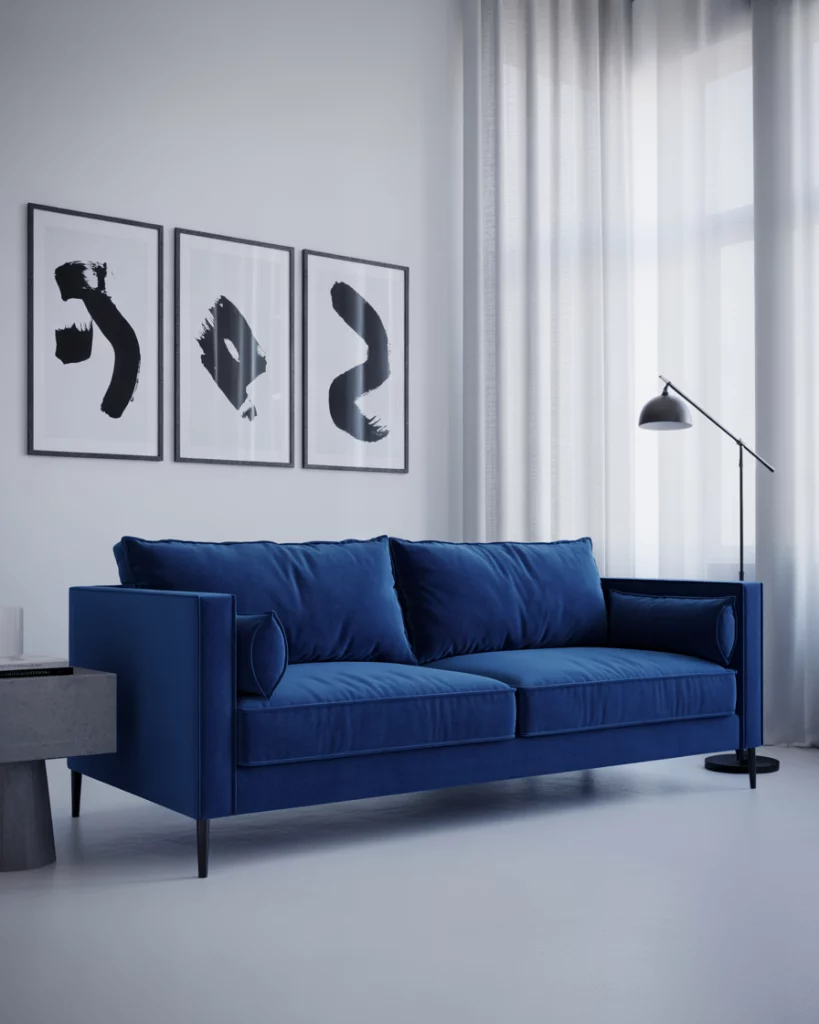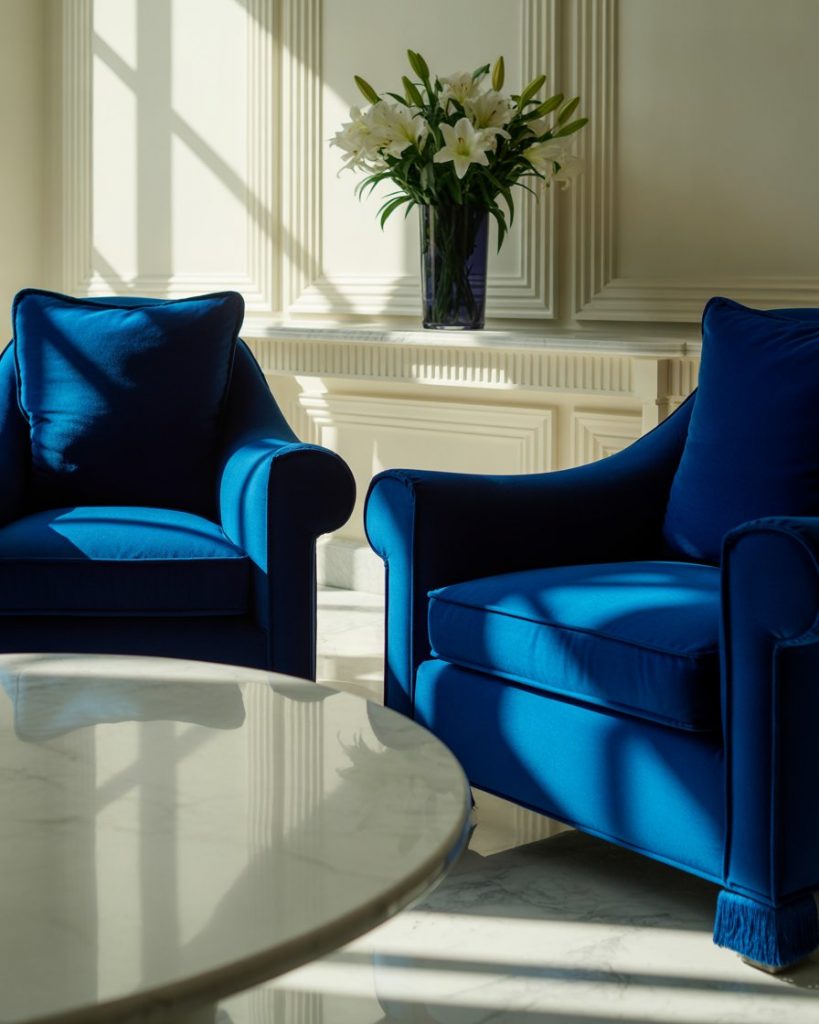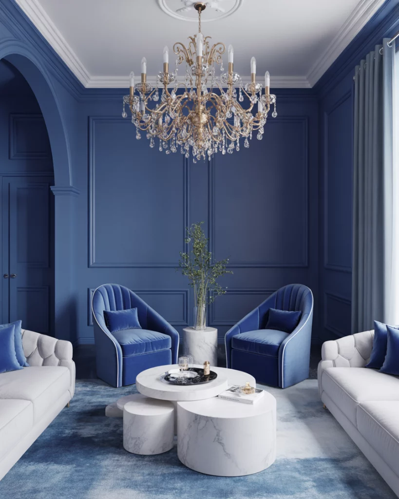 Using royal blue as the focal color gives your space a luxe, regal vibe. Mix it with white lacquered furniture and plush textiles. This approach is great for formal living rooms or entertaining spaces. Try a royal blue accent wall with velvet chairs and white marble side tables. Inspired by elements found in Elle Decor’s upscale living room features.
