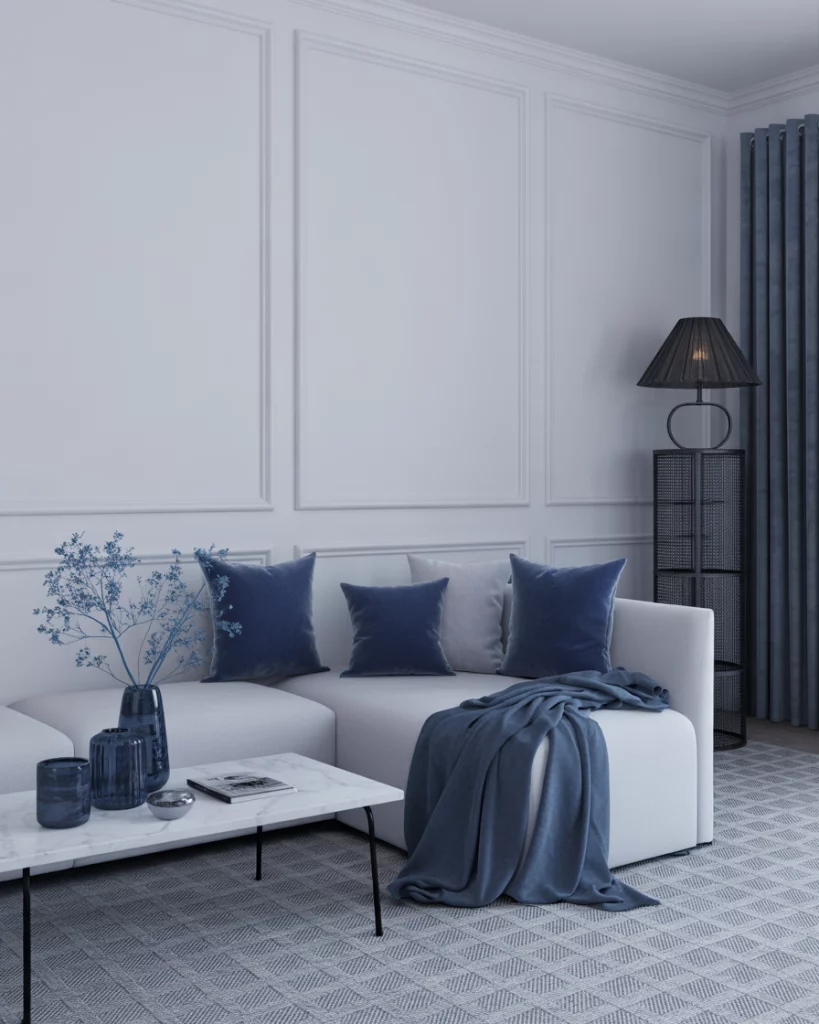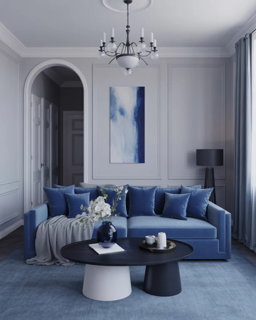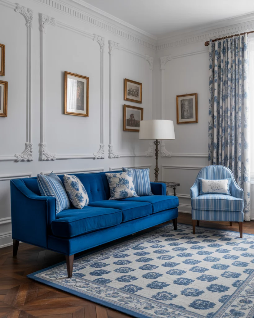 Go tonal with colour palettes that explore the full spectrum—from light to royal to dark blue—against a white base. This monochrome approach avoids monotony by layering textures: think velvet, cotton, and linen. Ideal for modern family spaces that want depth without clutter. Check House & Garden UK for layered tonal rooms.