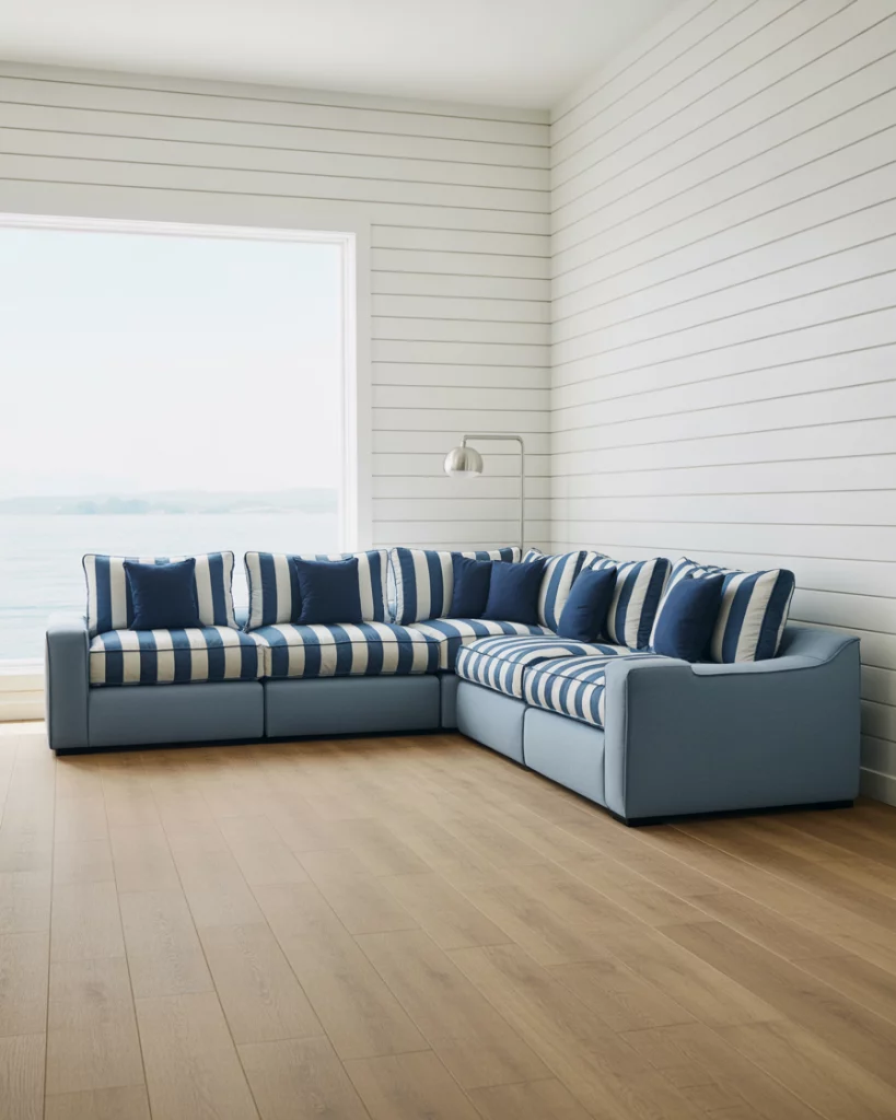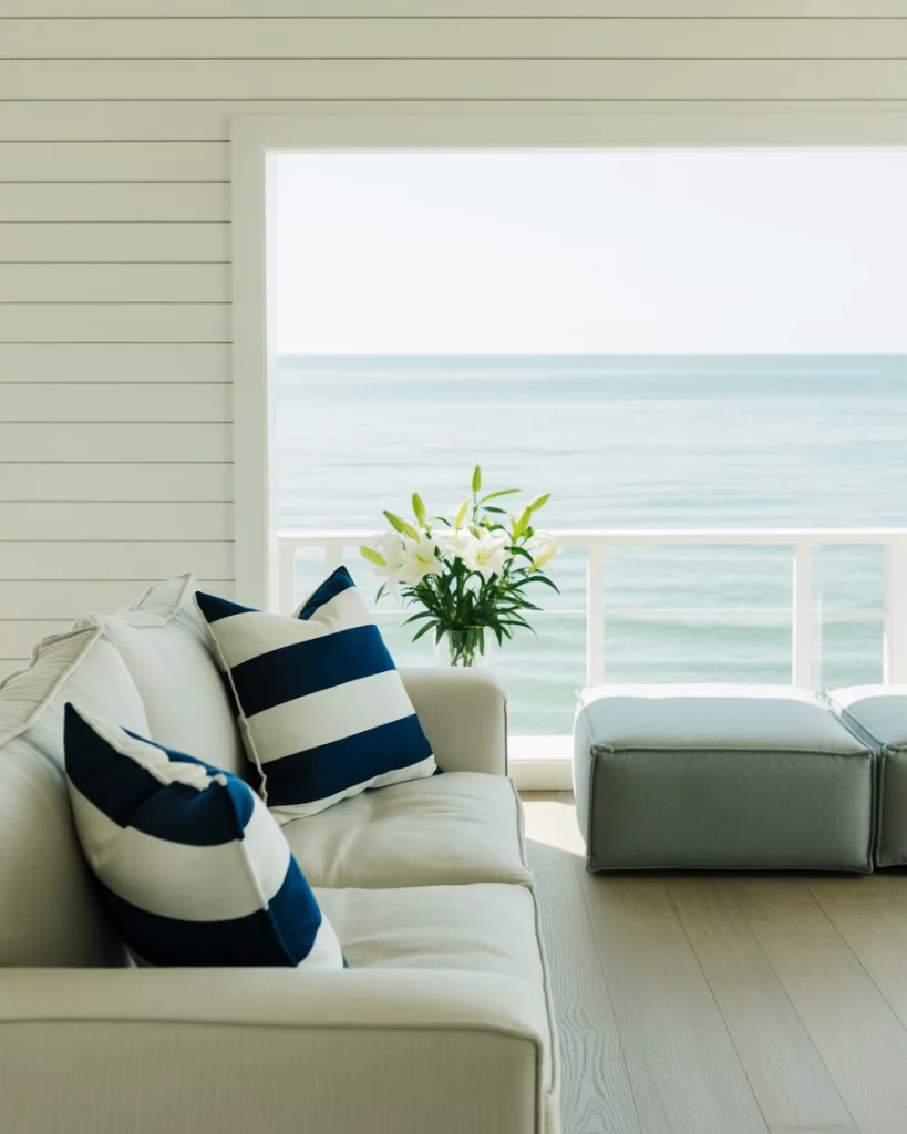 Merge nautical themes with modern lines for a look that feels both fresh and timeless. Use white shiplap walls, navy stripes, and marine-inspired accessories, but pair them with sleek furniture and uncluttered layouts. It’s a great compromise between beachy charm and urban sophistication. Look to Serena & Lily for this elevated coastal vibe.